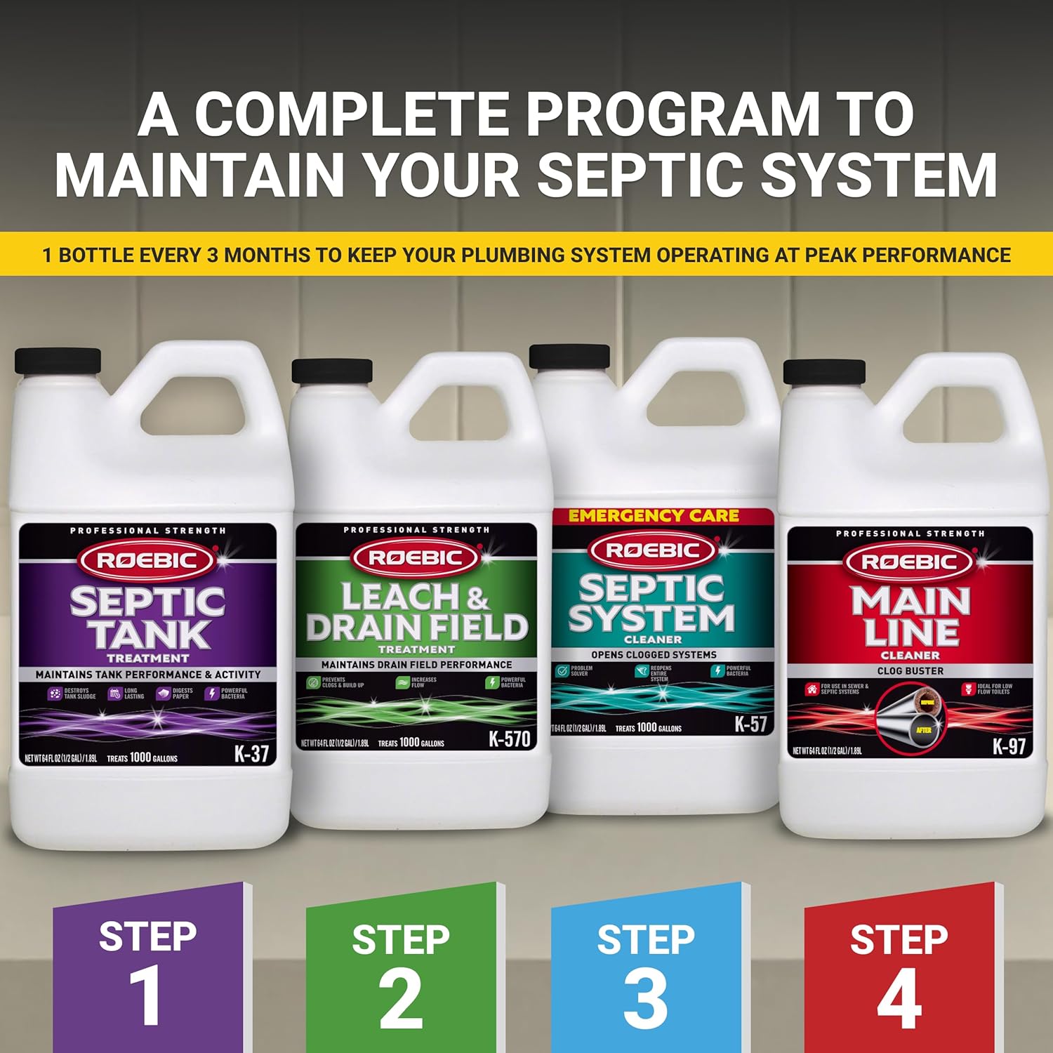 • MAIN LINE CLEANER: Tackle troublesome clogs and buildups with our Roebic Main Line Cleaner! Sewage and other debris tend to accumulate in both sewer lines and main lines leading to septic tanks, which can be a common problem in both new and old homes. Our main line enzyme cleaner is used for attacking this accumulated debris to quickly restore proper flow to your sewer lines or septic system