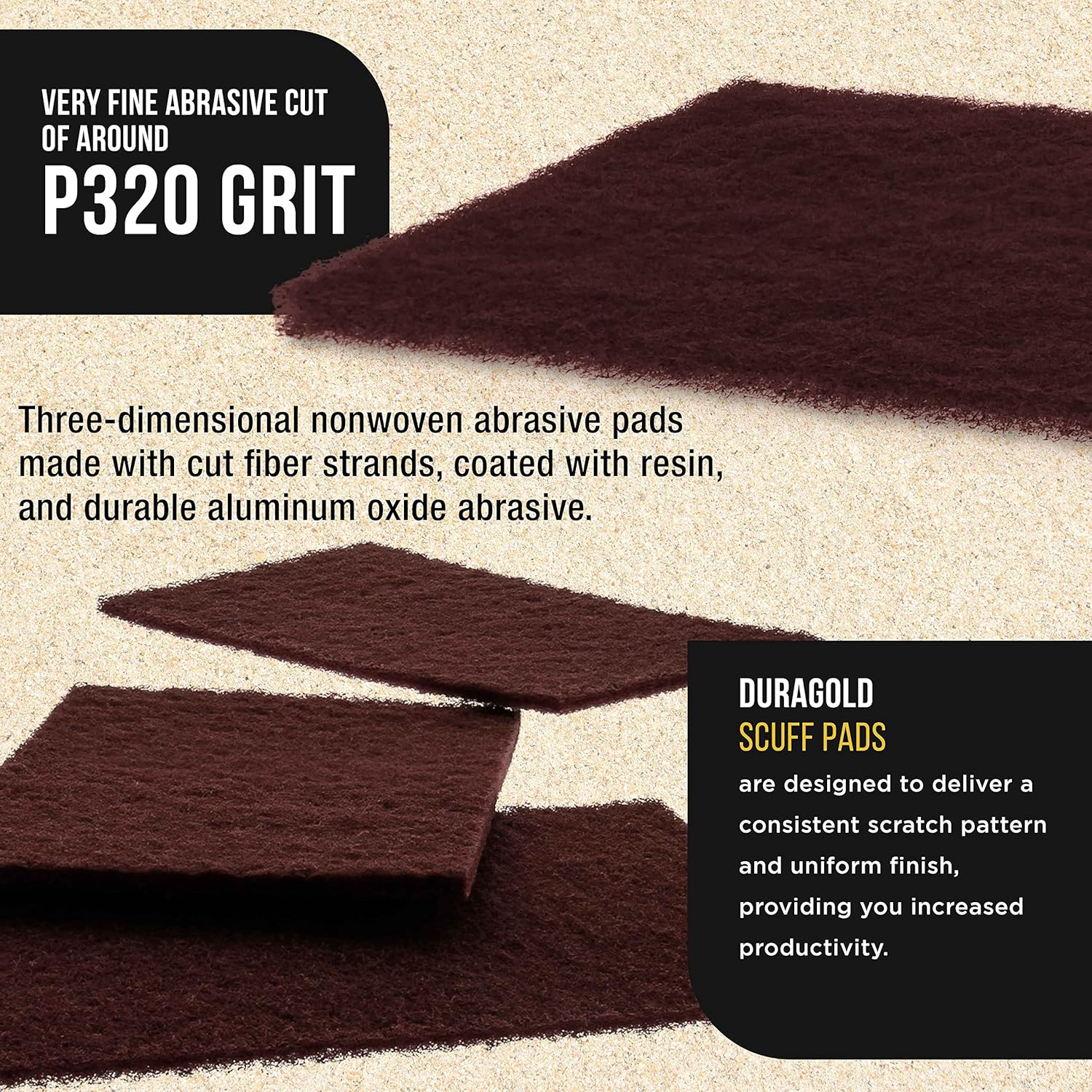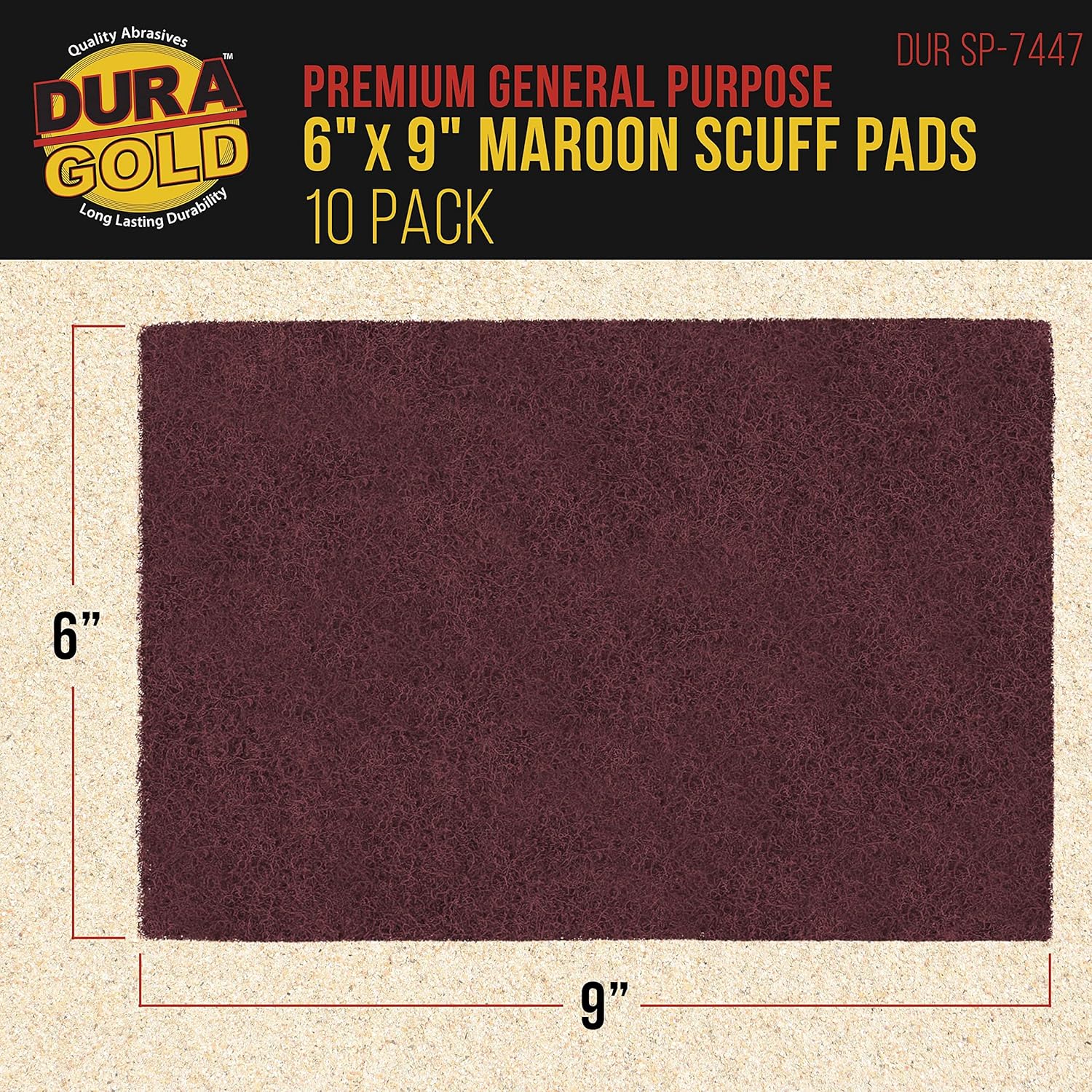 • Box of 10 Dura-Gold Premium 6" x 9" Premium General Purpose Maroon Scuffing Pads. High-performance maroon general-purpose scuffing pads that deliver a very fine aluminum oxide abrasive cut comparable to about a P320 grit sandpaper cut.
