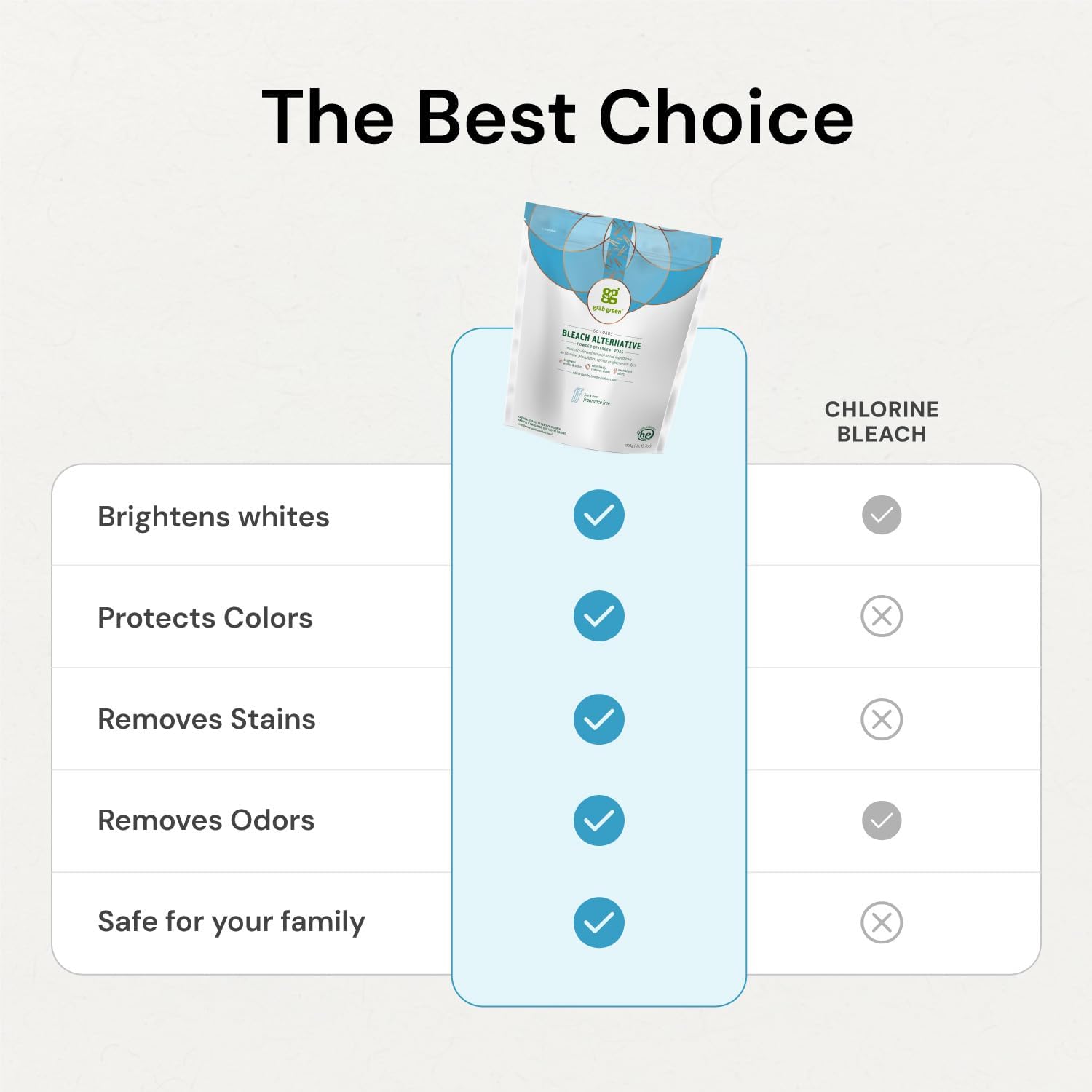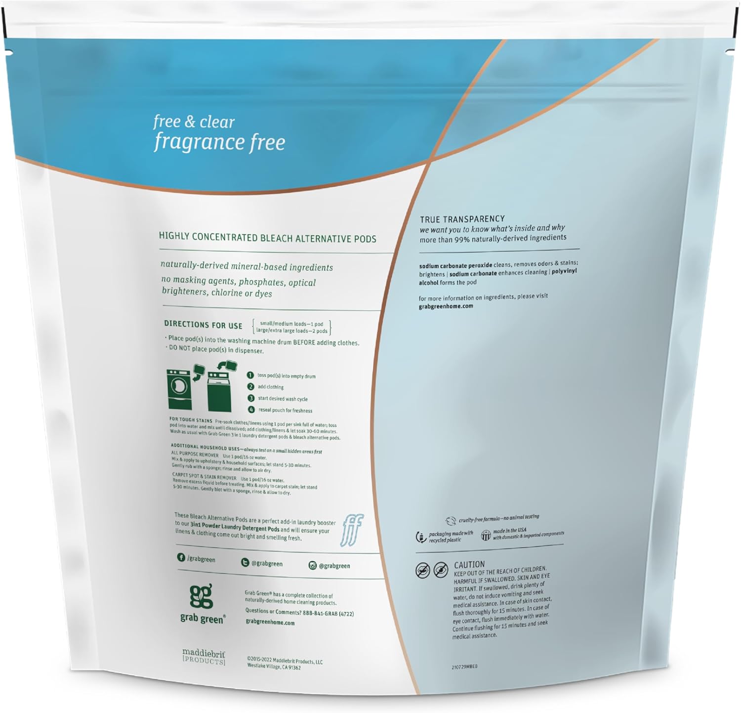 • Contains: 1- 132 Pod Bag of Grab Green Natural Fragrance Free Bleach Alternative Pods. Our velcro closure bags are convenient and easy to use, no hassling with frustrating zip closures