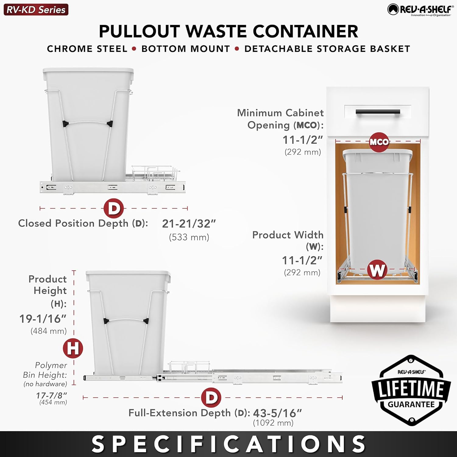 • Smooth Gliding Garbage Can: Built with a chrome-plated heavy-gauge wire construction frame that effortlessly slides in and out on full-extension, ball-bearing, rear basket for extra storage, lids are available and sold separately