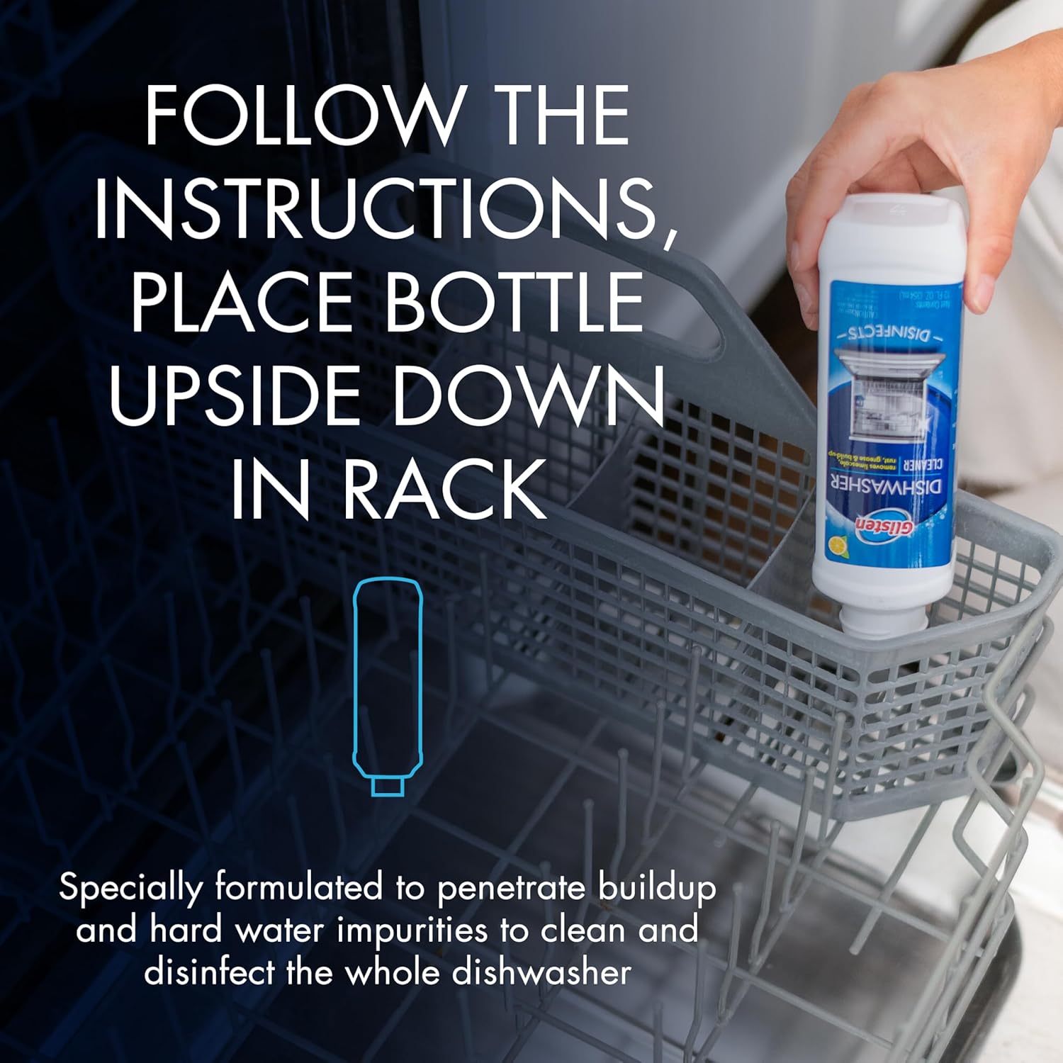 • Easy To Use: Place bottle upside down in silverware basket and run machine on the hottest cycle. Use monthly or as needed to keep your dishwasher clean, deodorized, and performing like new. Please refer to the package for detailed instructions.