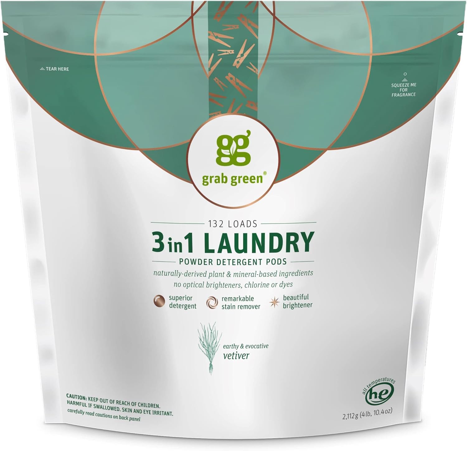 Grab Green 3-in-1 Laundry Detergent Pods, 132 Count, Vetiver Scent, Plant and Mineral Based, Superior Cleaning Power, Stain Remover, Brightens Clothes