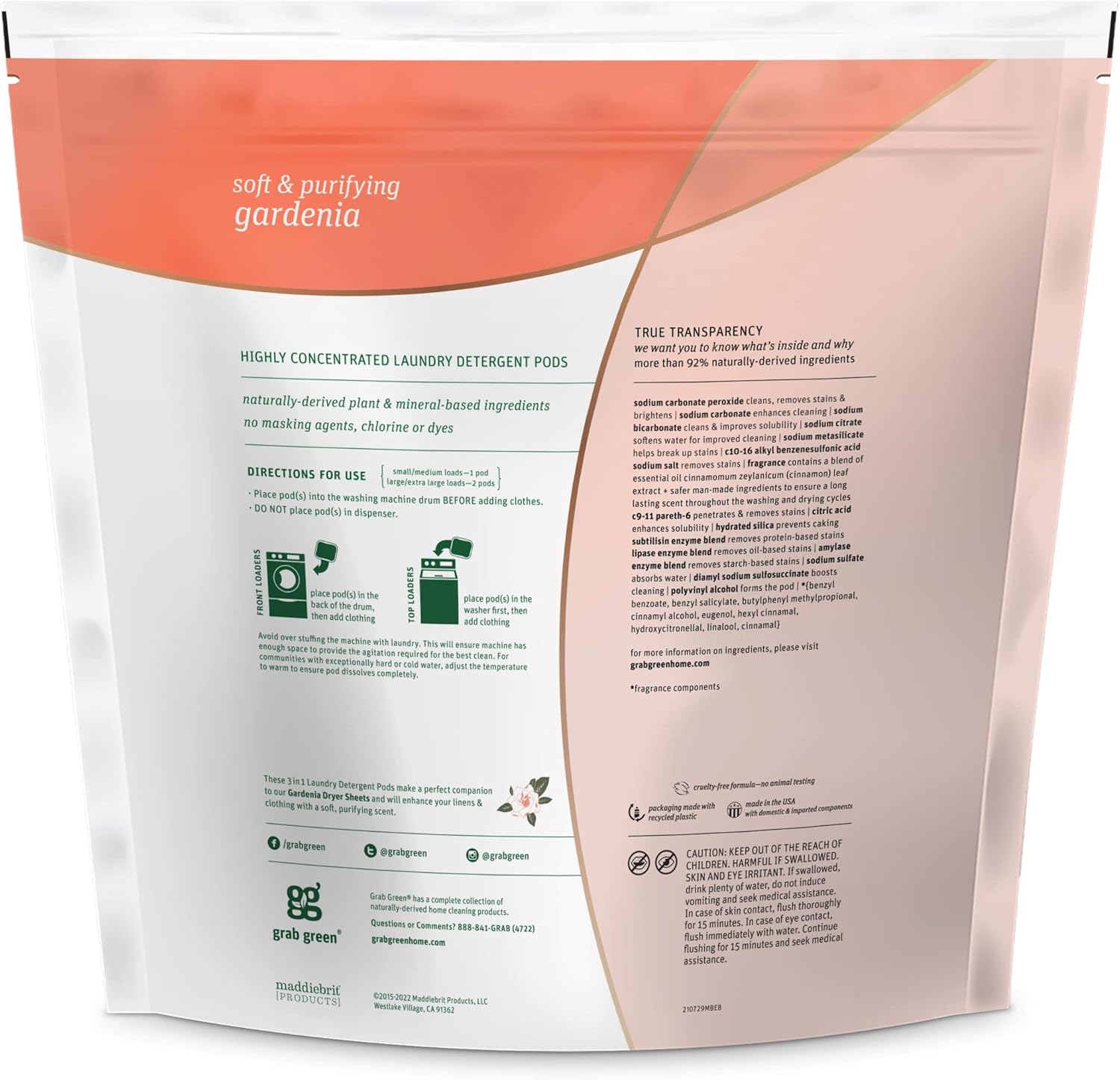• Contains: 1- 132 Pod Bag of Grab Green Natural Gardenia 3in1 Laundry Detergent Pods. Our velcro closure bags are convenient and easy to use, no hassling with frustrating zip closures