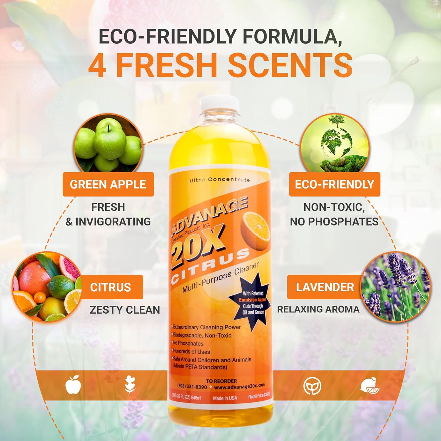 All Purpose Cleaner Concentrate - Advanage 20X The Wonder Cleaner Citrus for All Surfaces Around Bathroom, Kitchen, Oil and Grease | Multi Purpose Cleaner for Household Cleaning Solution | 32 Fl Oz
