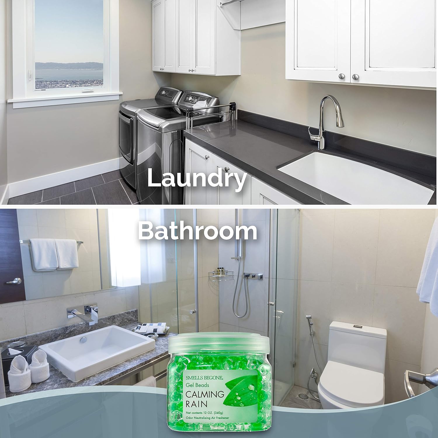 SMELLS BEGONE Odor Eliminator Gel Beads - Air Freshener - Eliminates Odor in Bathrooms, Cars, Boats, RVs and Pet Areas - Made with Essential Oils - Calming Rain Scent - 12 Ounce