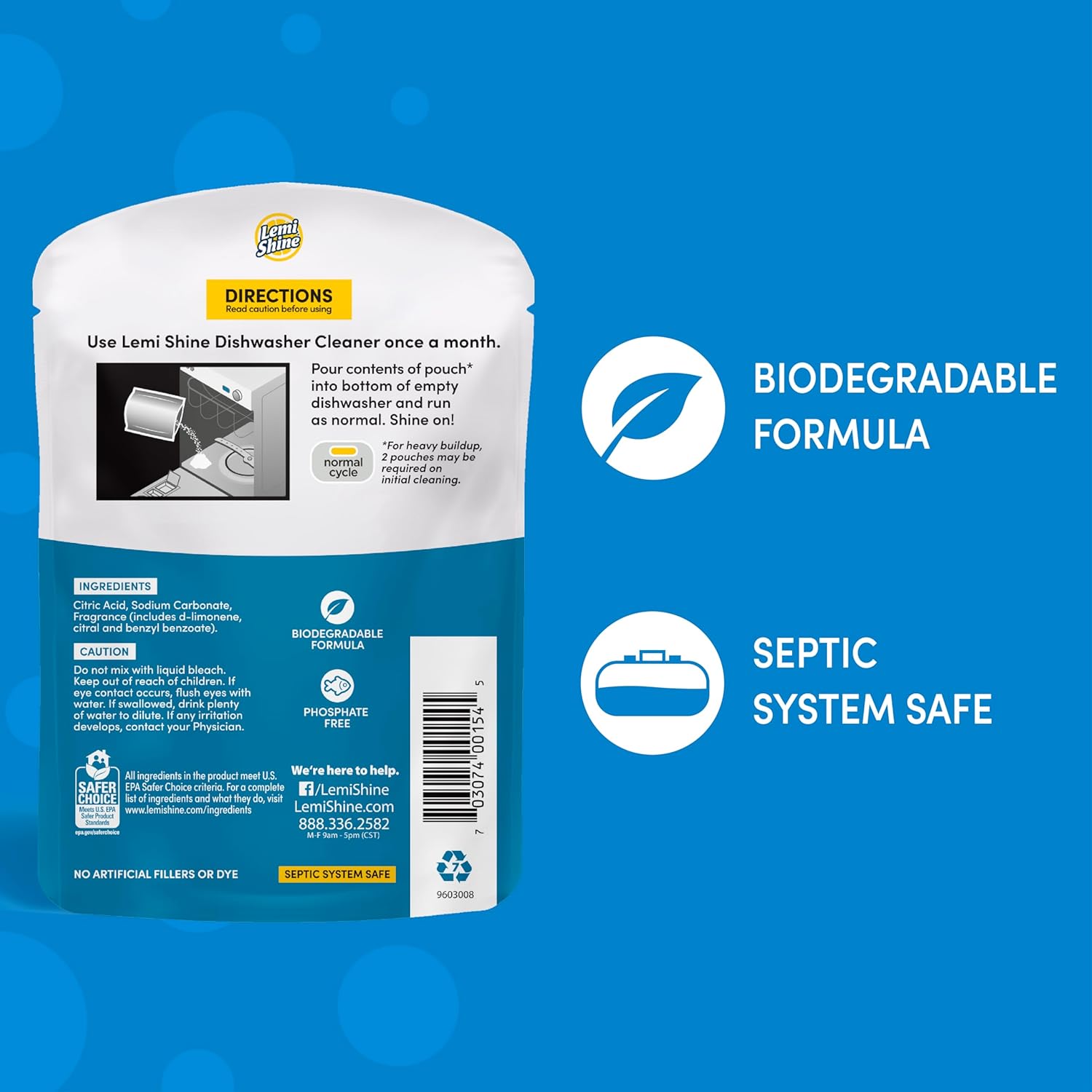 Lemi Shine Natural Dishwasher Cleaner - Hard Water Citric Acid Cleaning Powder - Lemon Scented Eco-Friendly Dishwasher Cleaner & Deodorizer - 1.76 oz