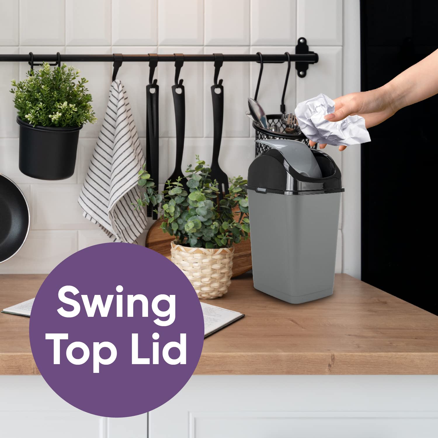 Superio Mini Plastic Trash Can with Swing Top Lid 1.25 Gallon Compact Small Waste Bin Portable Garbage Can for Countertop, Desktop, Make up Vanity, Bathroom, Car, Under Sink, Dorm 5 Qt. (Grey/Black