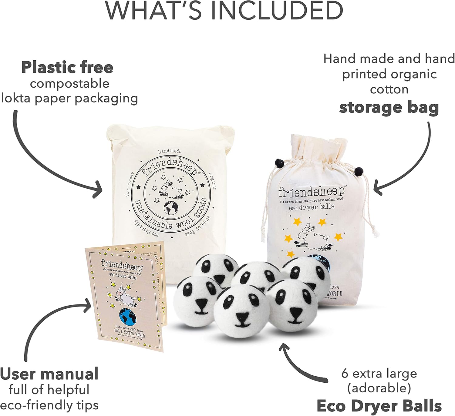 Friendsheep Wool Dryer Balls 6 Pack XL Organic Premium Reusable Cruelty Free Handmade Fair Trade No Lint Fabric Softener - Panda Pack