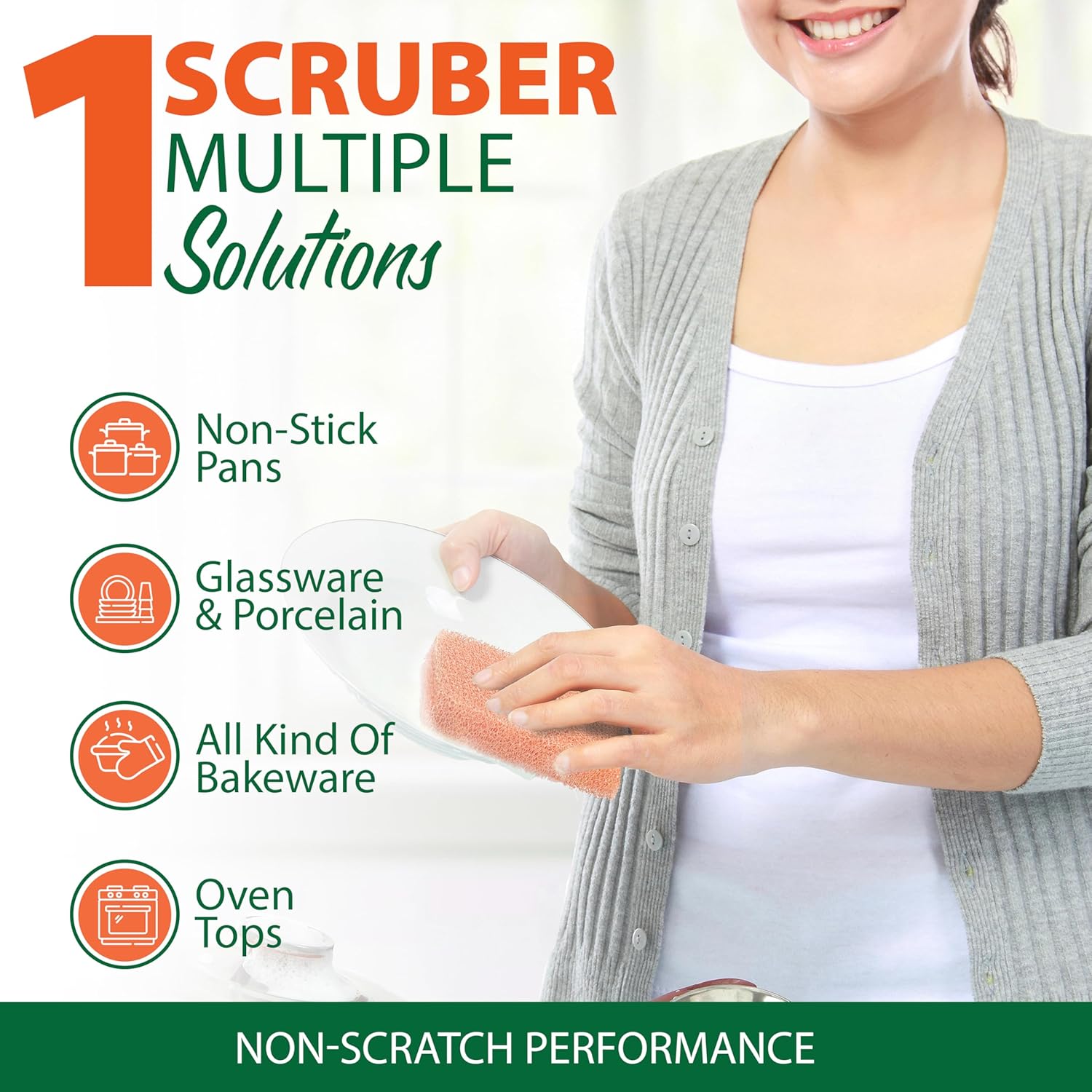 • Refresh your cleaning routine with our scrubber infused with fresh peach fragrance. Turning your kitchen sponges into tools that make your space smell great while you clean. Enjoy a fresher, more delightful cleaning experience with every use
