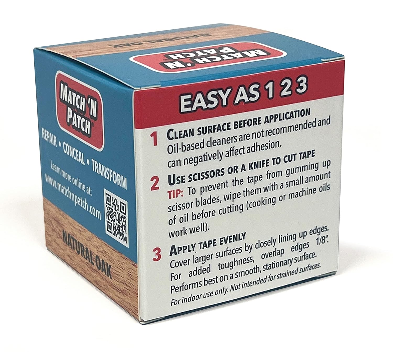 - MATCHING OPTIONS AVAILABLE: The Natural Oak pattern is part of a broader collection, available in a larger size for extensive repair needs. Visit the MATCH ’N PATCH Store to explore all 13 wood tape shades and find the perfect match for your project.