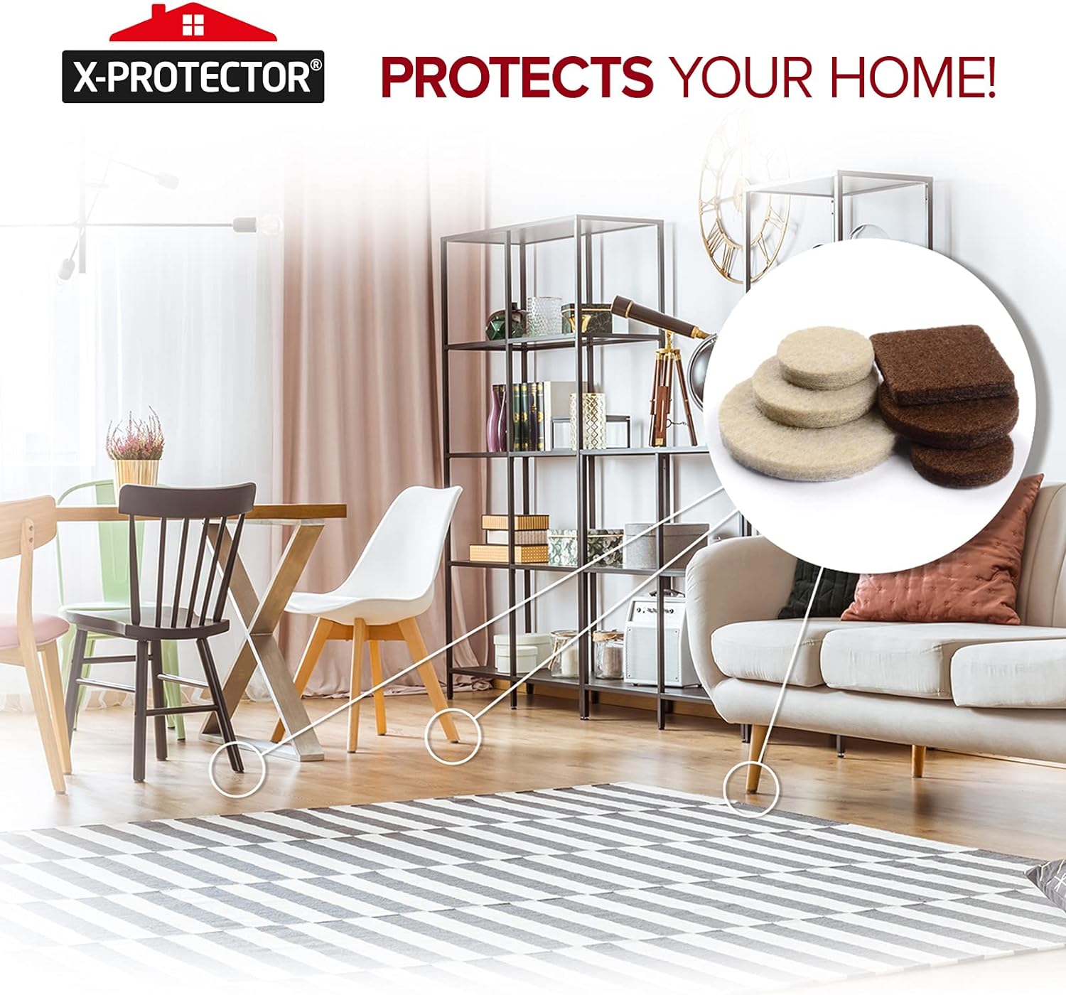 • ✌ X-PROTECTOR FURNITURE FELT PADS – best protection for Your wooden, laminate or tiled floors. Our furniture coasters create strong shields between floor and furniture, desks & tabletops, which carefully protect surfaces from scratches and scuffs.