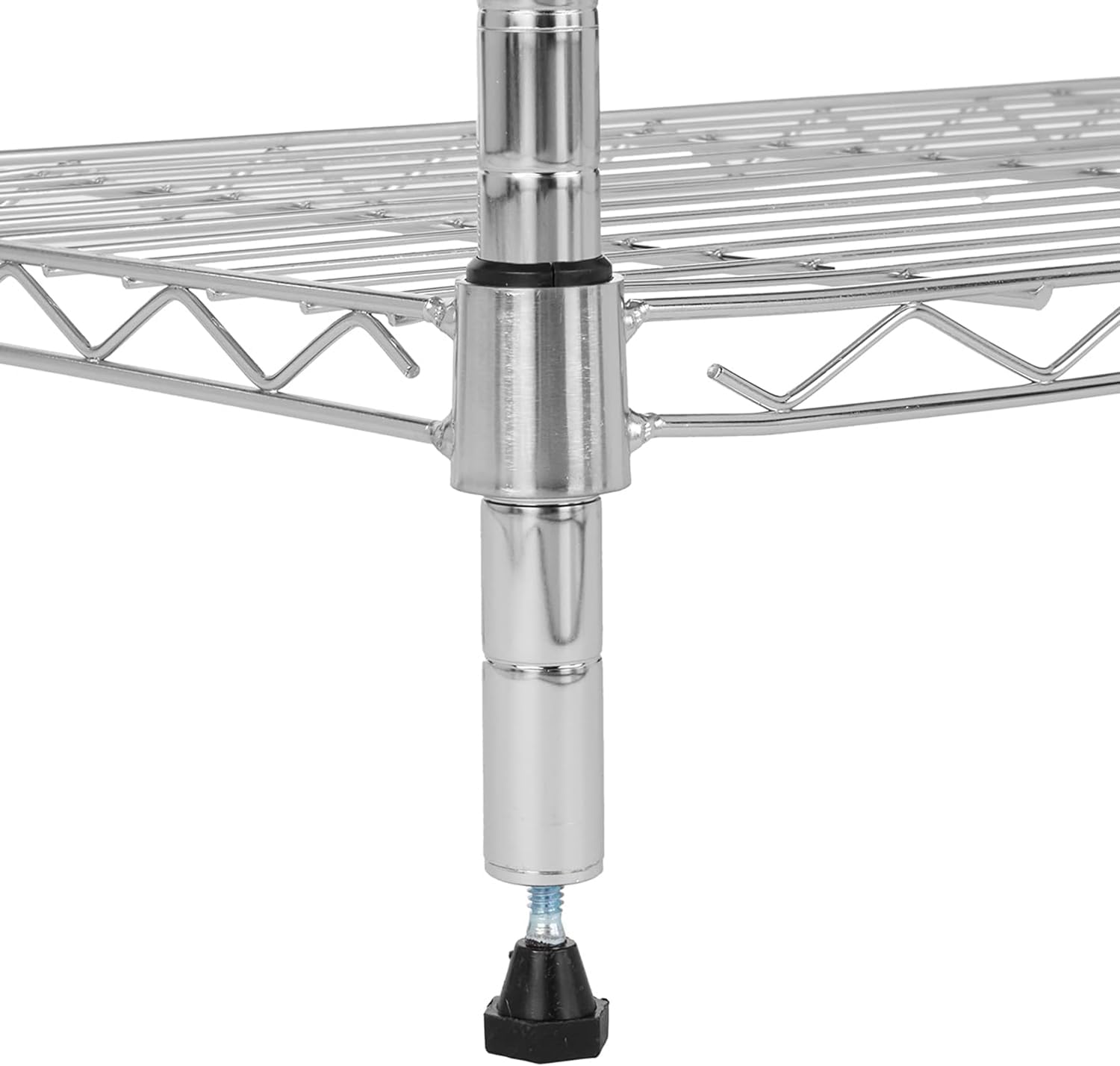 • Durable steel construction with a Chrome finish; each shelf holds up to 250 pounds, evenly distributed; 750 pound total weight capacity