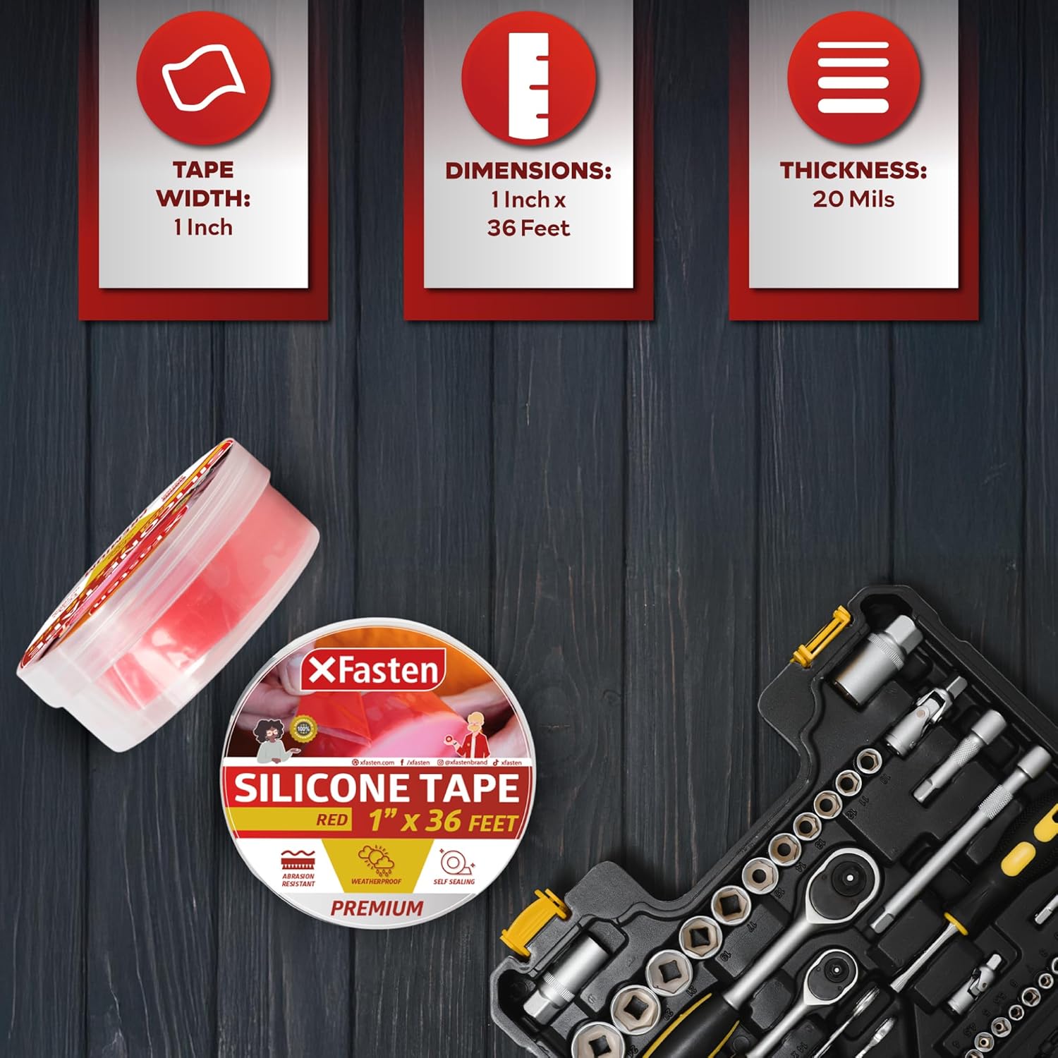 XFasten Self Fusing Silicone Tape Waterproof – 1" x 36 Feet Red, Self Amalgamating Tape, Silicone Rubber for Plumbing, Sealing Pipes, Hose Repair, Outdoor Coax and Electrical Cables – Weatherproof