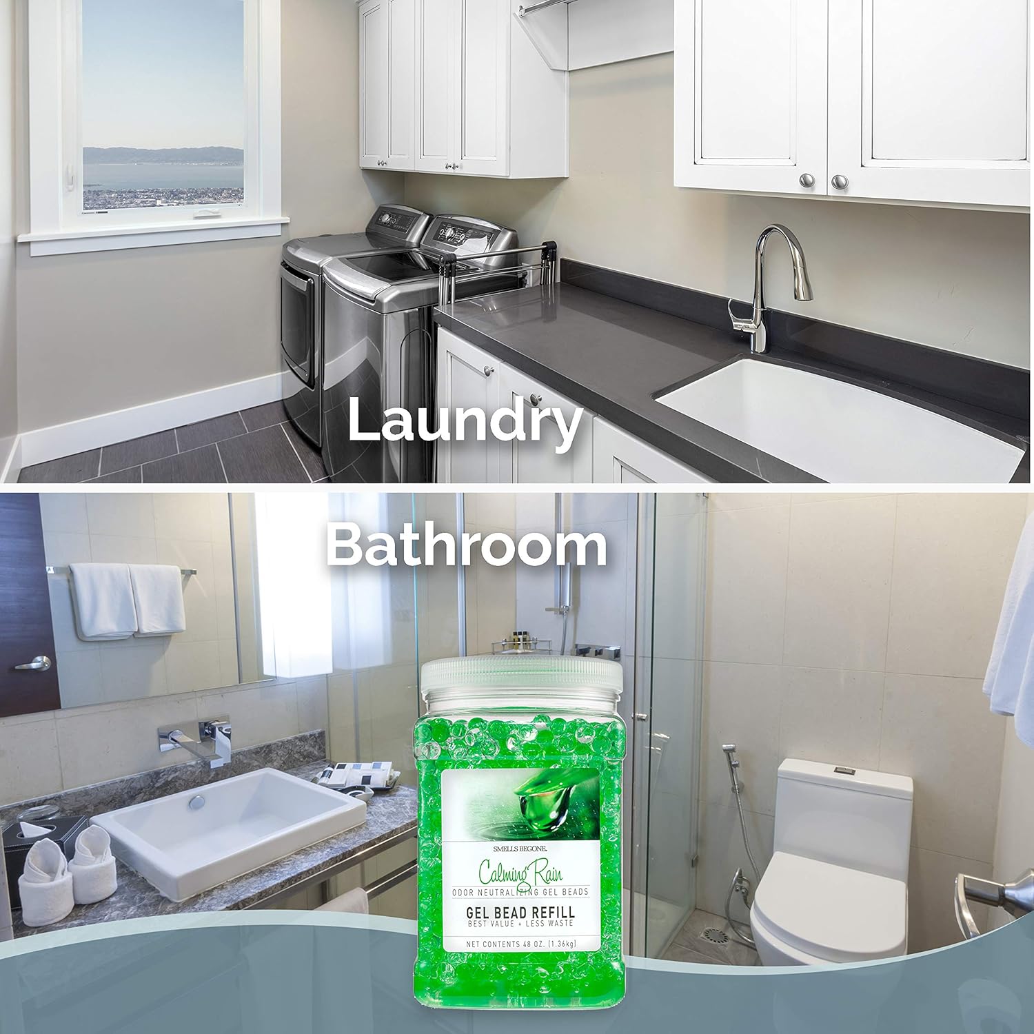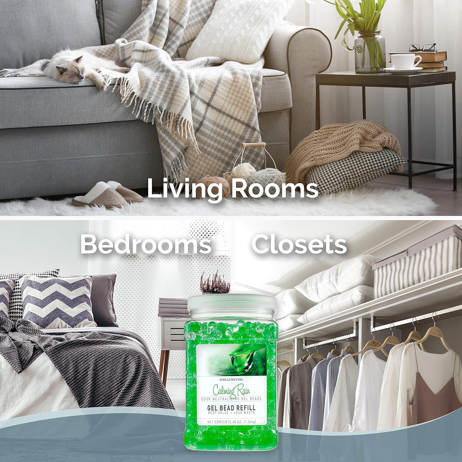 SMELLS BEGONE 48 oz Odor Eliminator Gel Bead Refill - Odor Eliminator for Bathrooms, Cars, Boats, RVs & Pet Areas - Made with Essential Oils - Calming Rain Scent