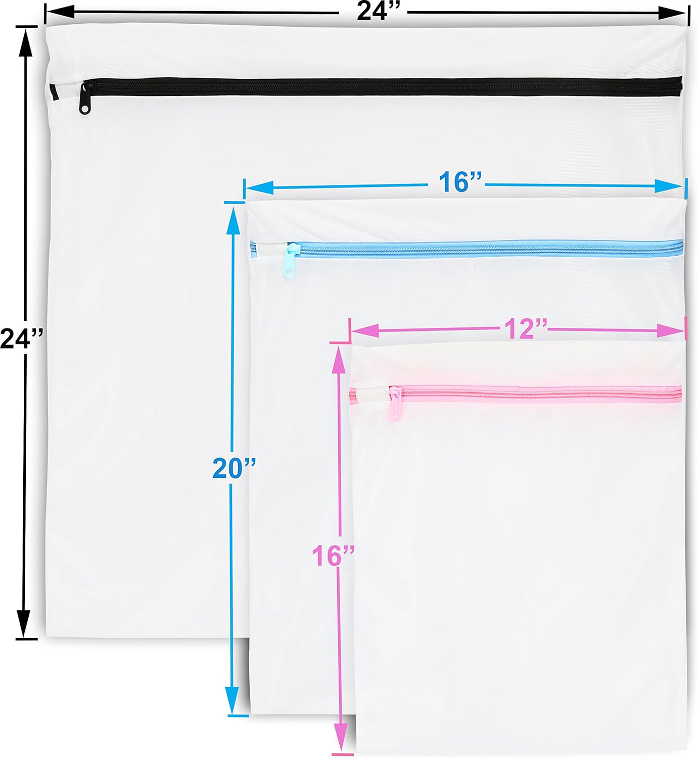 • Durable mesh wash bag and rust-free zippers. XL Black, L Blue, M Pink zippers.