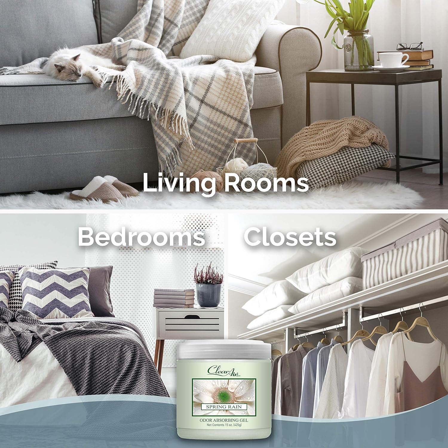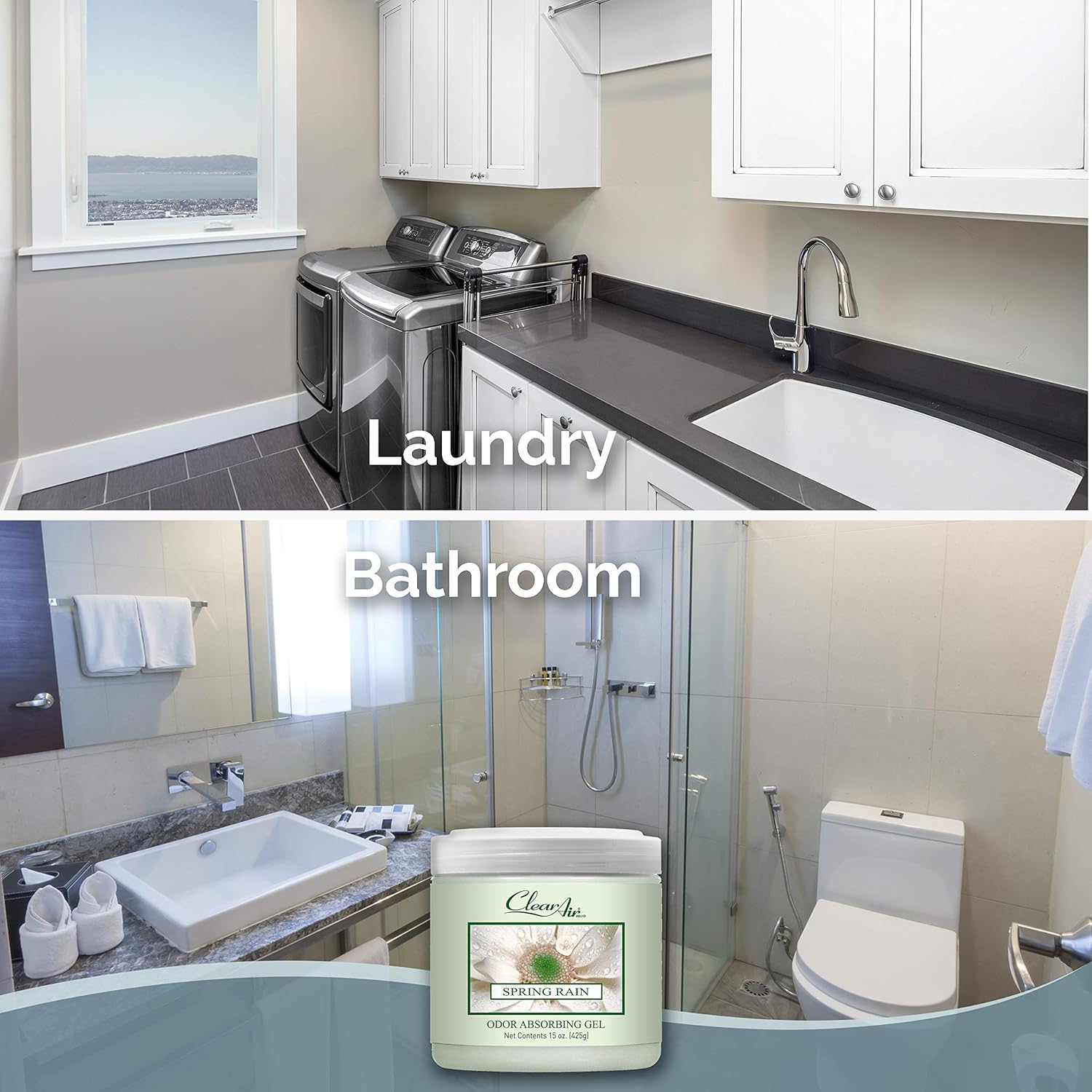 Clear Air Odor Absorber Gel - 15 oz, Pack of 2 - Air Freshener Absorbs and Eliminates Odors in Bathrooms, Cars, Boats, RVs and Pet Areas - Made with Essential Oils - Spring Rain Scent