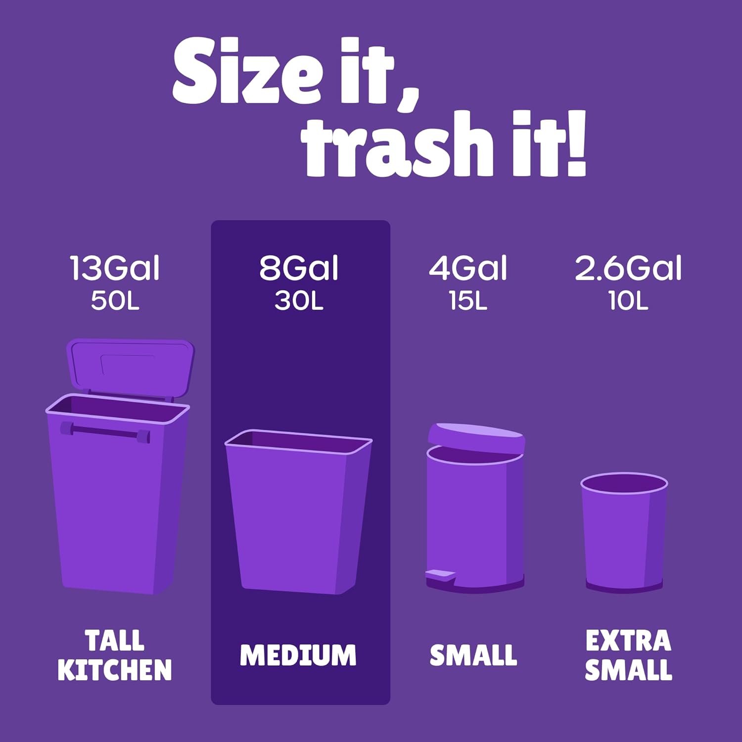 • Dimensions - 21 inches * 25.2 inches. 150 count of 8 gallon trash bags. Thickness: 0.48mil. Fit most of medium size trash bins. Our trash bags are all no smell, good for health.