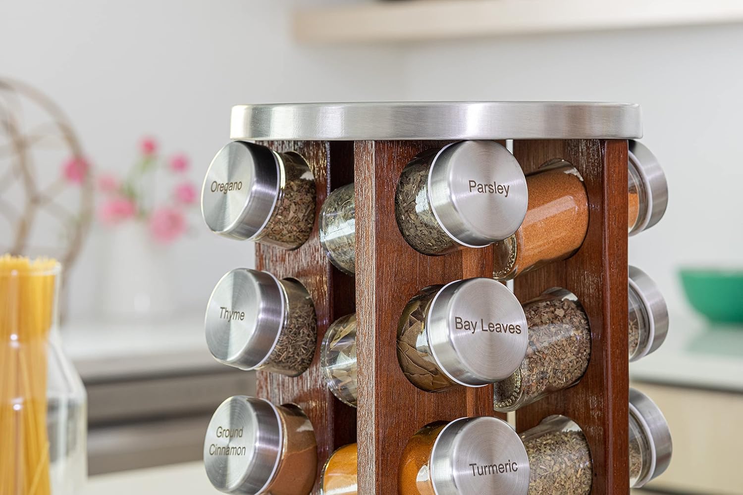 • HIGH QUALITY: This spice rack combines the warmth of wood with the cool sheen of genuine stainless steel. The result of this happy union is an elegant expression of culinary art that fits in with any kitchen decor.