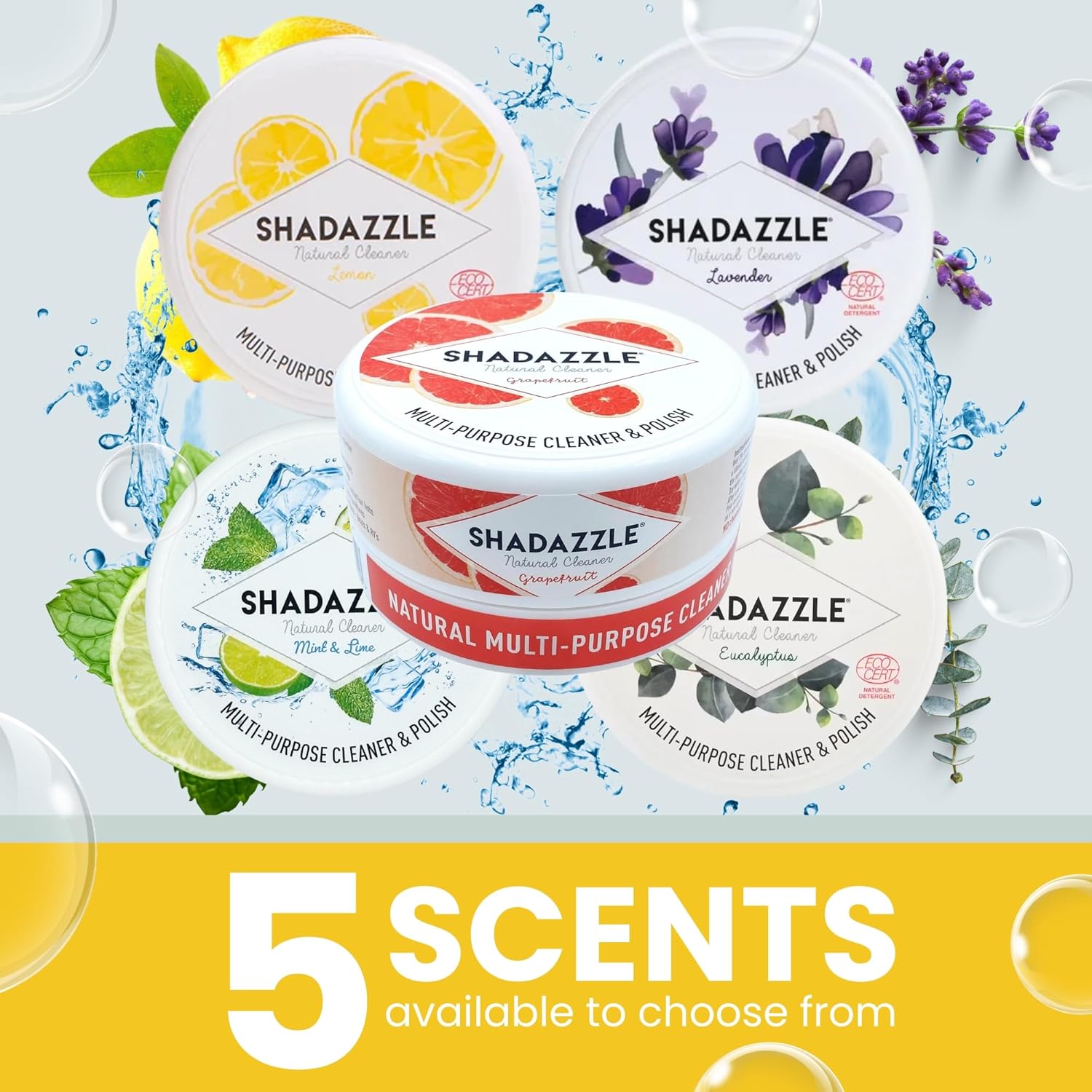 • NATURAL ALL PURPOSE CLEANER : Shadazzle is a multi purpose cleaner that works on any washable surface. It is made with natural ingredients only : clay, vegetal oil, vegetal glycerin, lemon fragrance. No harmful chemicals or phosphates
