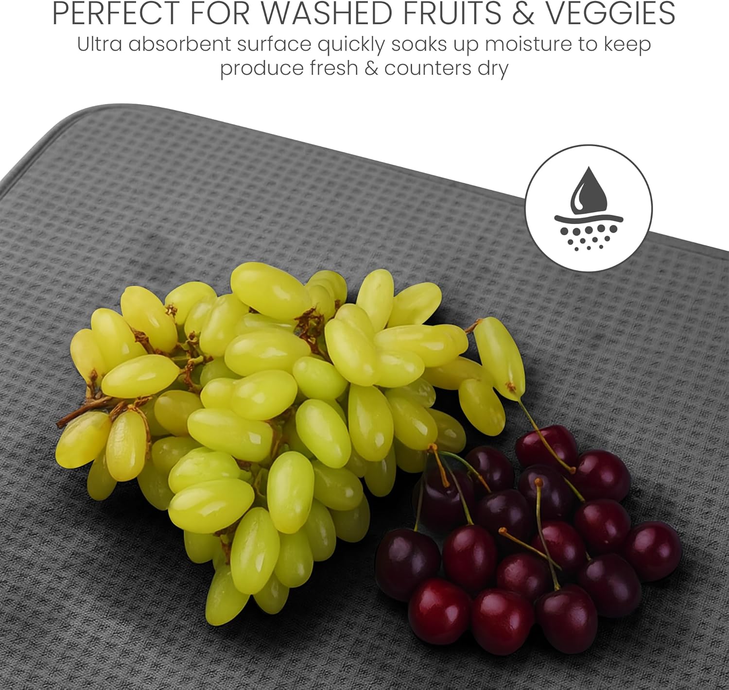 - THICKEST , STYLISH MAT | INNOVATIVE HONEYCOMB WEAVE: Keep your counter spotless even while washing a sink full of kitchen dishes . Our superbly stylish drying mat is among the thickest on the market today , and its innovative honeycomb microfiber structure enhances absorption and quickens drying time . Idea kitchen accessories for countertop