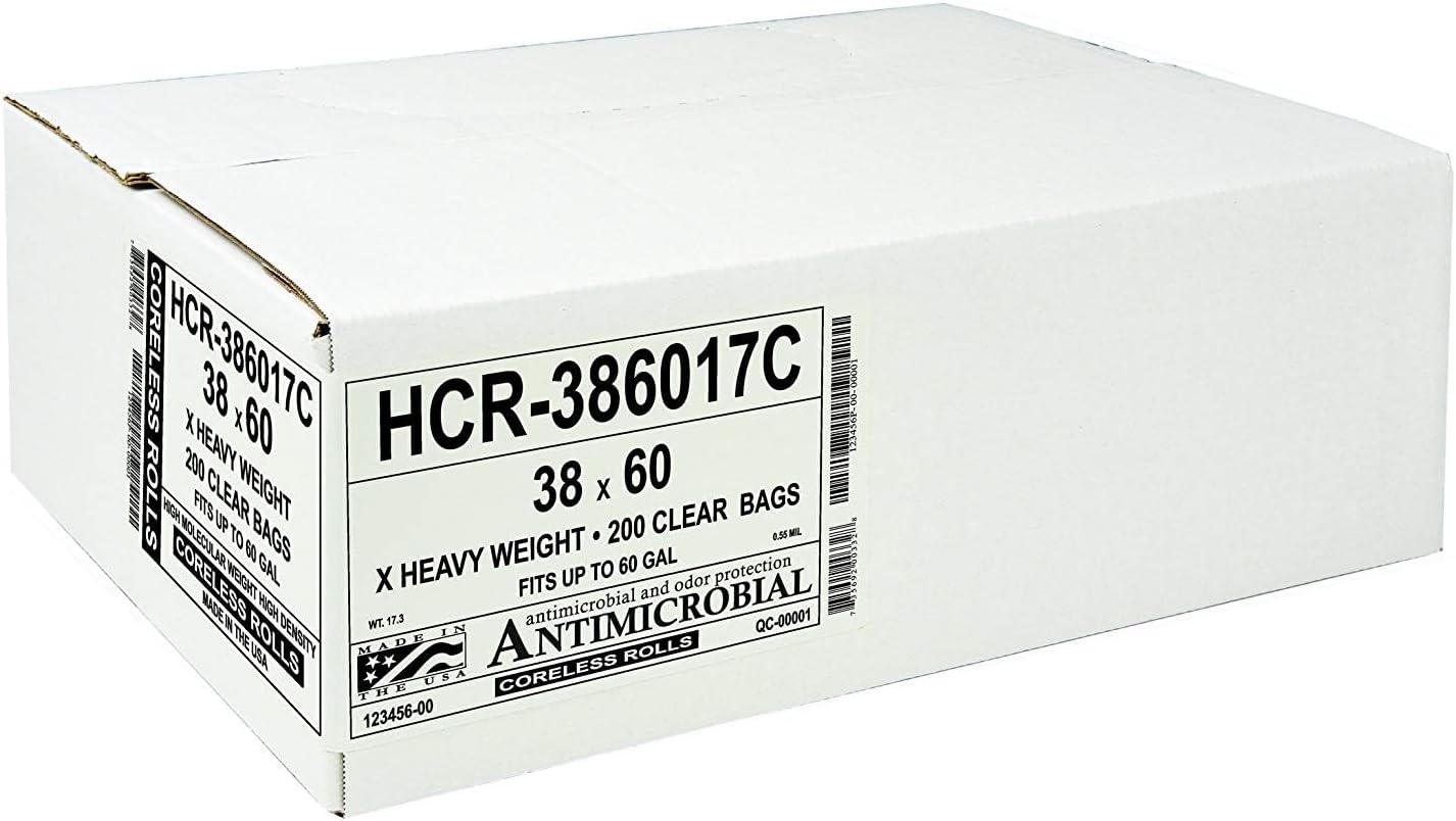 Aluf Plastics High Density Trash Bags, 60 Gallon, 200 Count, 14 Micron (eq), 38" x 60", Clear, for Bathroom, Office, Industrial, Commercial, Janitorial, Municipal, Recycling