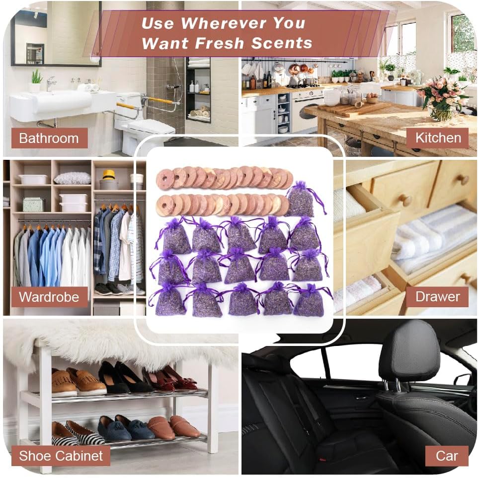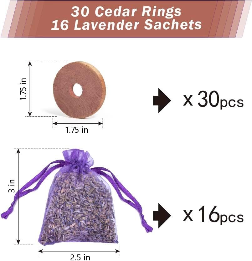 • Included: 30 small red cedar rings, and 16 lavender flower sachets. Shake the bag or squeeze the sachets a little before use for a strong lavender fragrance.