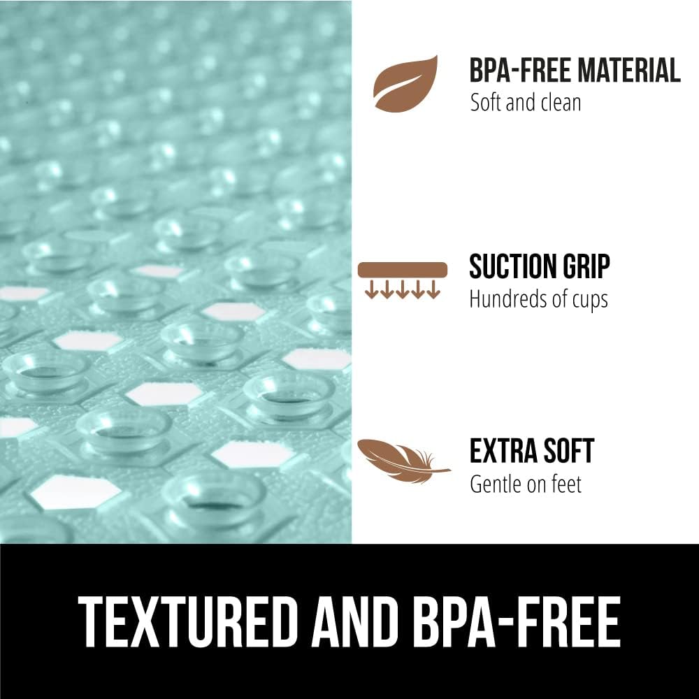 • TEXTURED AND BPA-FREE: the mat is constructed from BPA free materials; it features a unique hexagon design with a pebble textured topside that is soft on feet; shower mat is soft, flexible, and perfect for the whole family