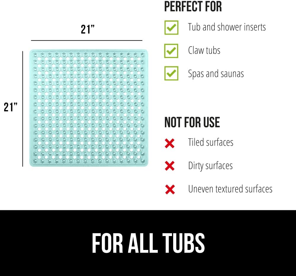 • OVERSIZED AND MACHINE WASHABLE: the shower mat is so easy to clean, simply machine wash and air dry; you can easily air dry the shower mat by hanging it over the side of the tub; square mat is conveniently sized 21” x 21” providing excellent coverage for standing showers