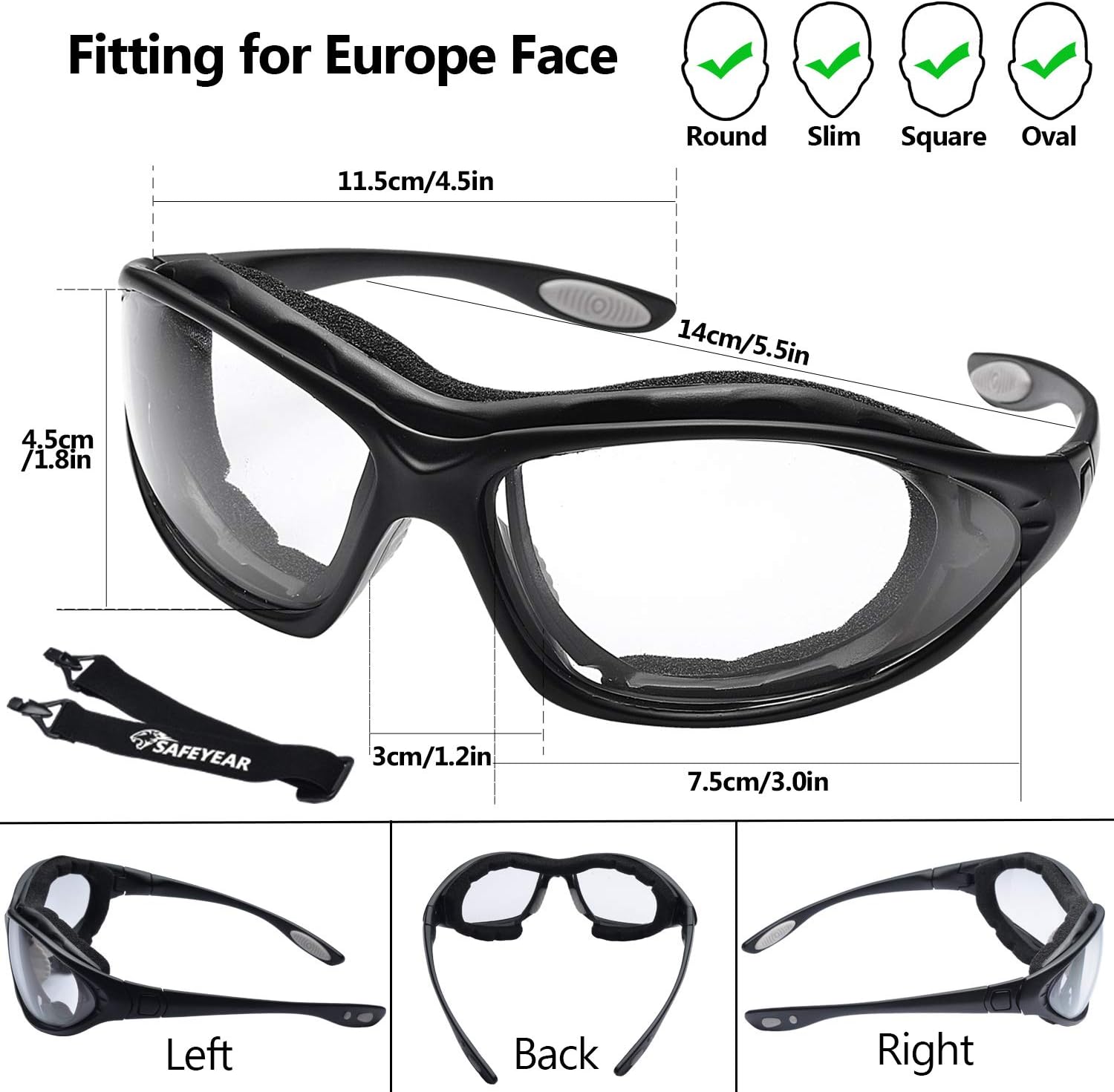 - 🏥【DESIGNED TO BE PROTECTIVE AND BUILT TO LAST】: SAFEYEAR Anti fog safety goggle over glasses keep your eyes safe from direct and peripheral threats with a strong and durable polycarbonate wraparound construction. The adjustable elastic band helps you get the fit just right. Also protects eyes from 90-99% of harmful UV radiation, Ligth Weight Adult Work Glasses 100% from tear Off, protect your eye far from sunshine harmness