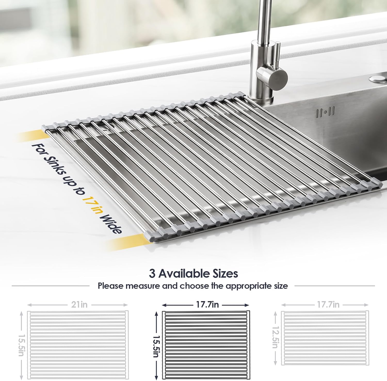 - [Universal Fit] - Choose from our three sizes: 17.7 x 12.5in, 17.7 x 15.5in, 21 x 15.5in to fit your sink. Confirm sink size and select from options above on this page. Current selection: 17.7 x 15.5in
