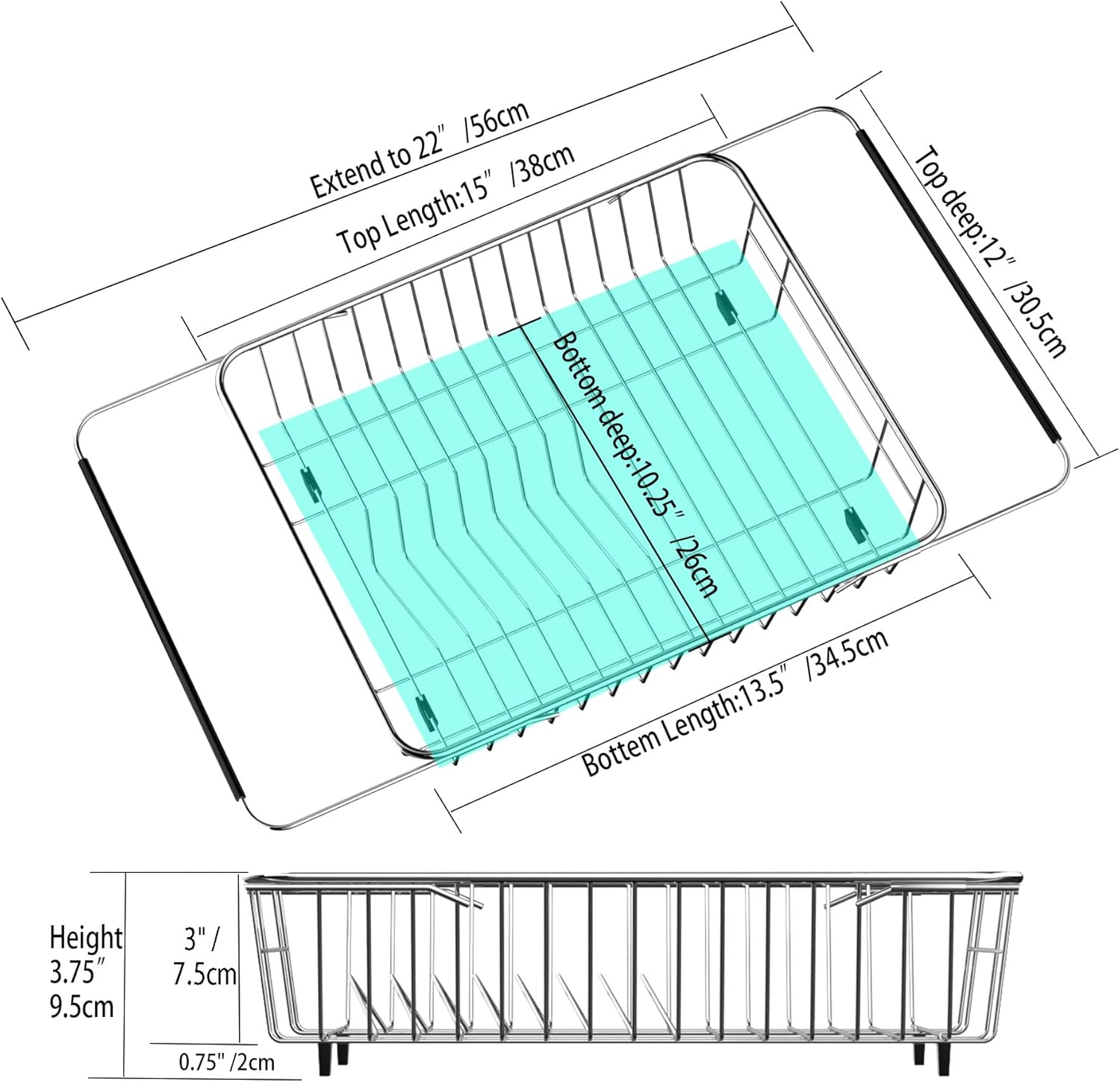 • SIZE DETAILS - Please check the picture 2. Drain basket Height:3.75". length and depth of top of basket:15in x 12in, Length and depth of bottom of basket:13.5in x 10.25in ; Drain basket arm extends 15 to 22 inches long and it can place over the sink measuring between 16 to 22 inches and more than 12.5 inches deep. With extendable arm, it can be used over the sink, on the countertop or in the sink to save space in compact kitchens.
