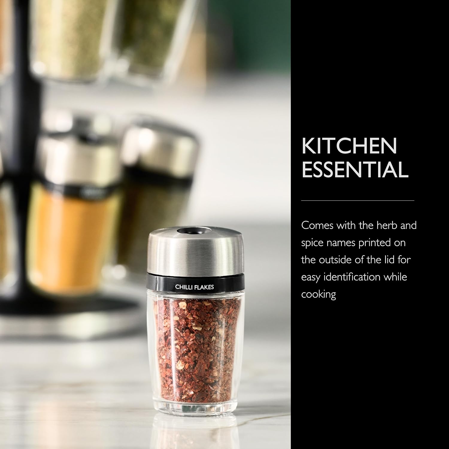 • Spice Rack with Jars: Keep this spinning spice rack tidy with stainless steel caps and spice labels