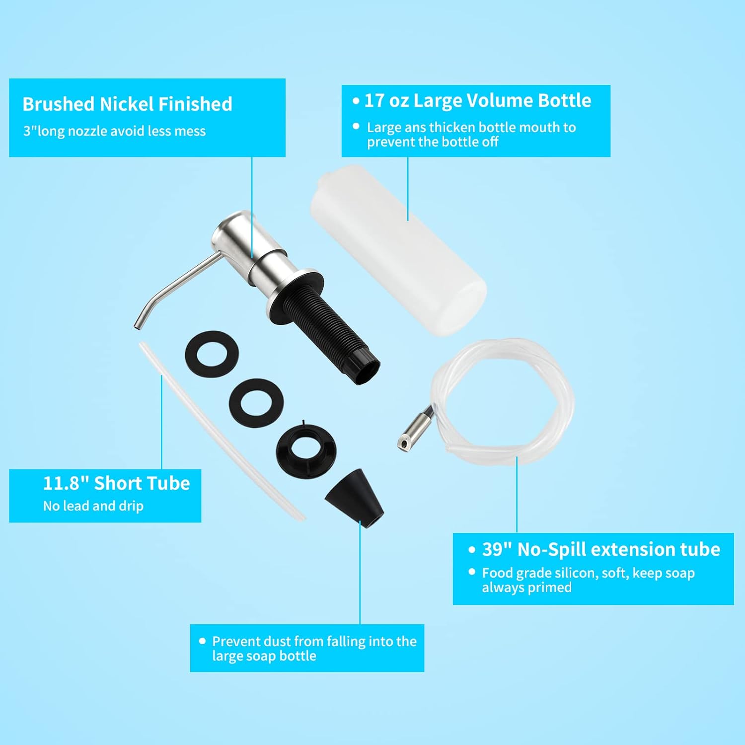 - ๐งใ NO MORE REFILL REQUENTLYใ The Countertop Soap Dispenser for kitchen sink comes with 17oz large volume bottle, it can be connected to bottle or extension tube,once filled, can last longer. The long nozzle of soap dispensers will make sure no soap will sprinkle on the sides of your sink. No more sticky and dirty areas. Your kitchen sink will look much more precious and clean.