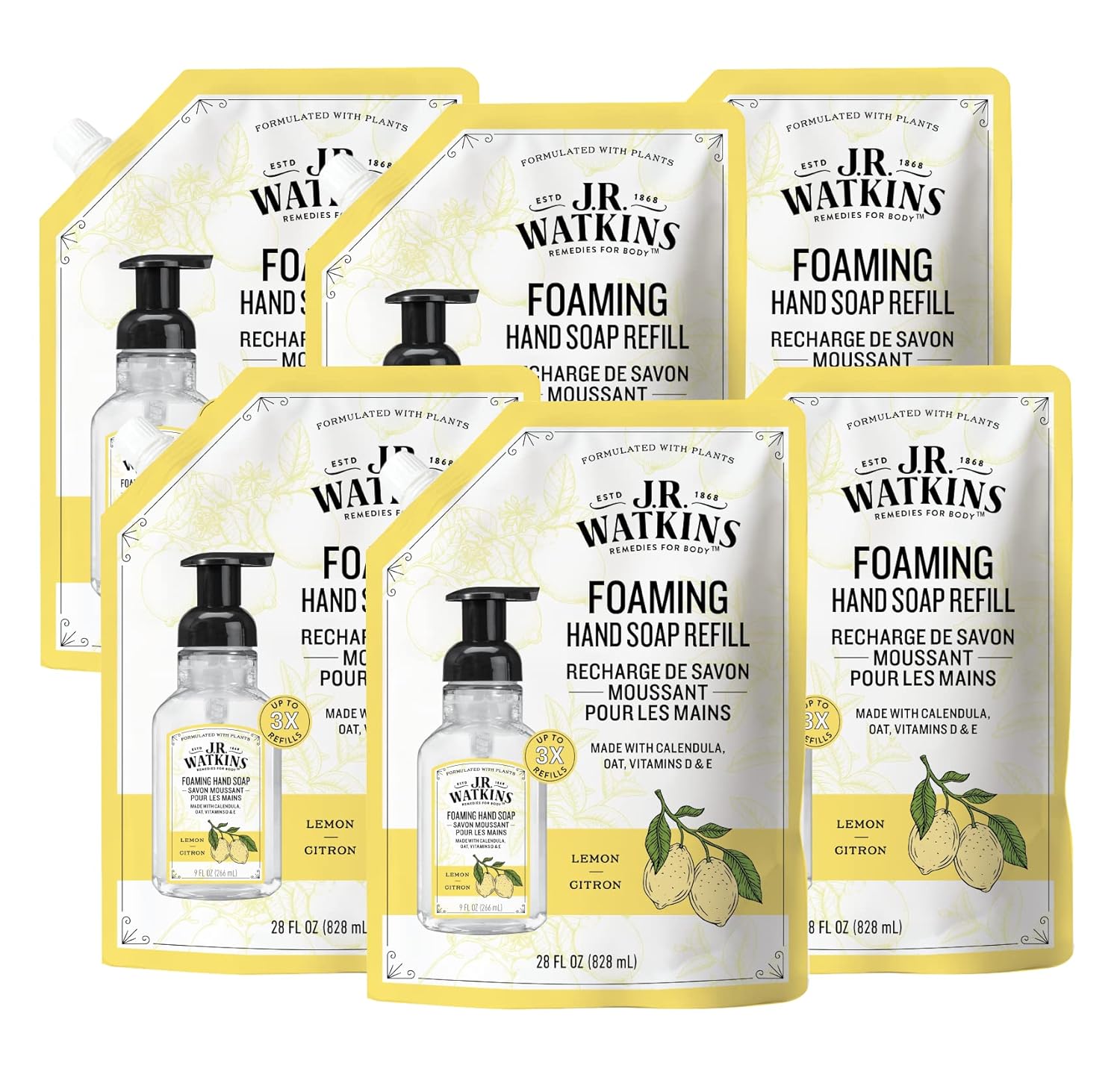 J.R. Watkins Foaming Hand Soap Refills, , Alcohol-Free Hand Wash, Cruelty-Free, , Moisturizing Hand Soap Refill for Bathroom or Kitchen, Lemon 28 fl oz Foam Soap Refill, 6 Pack