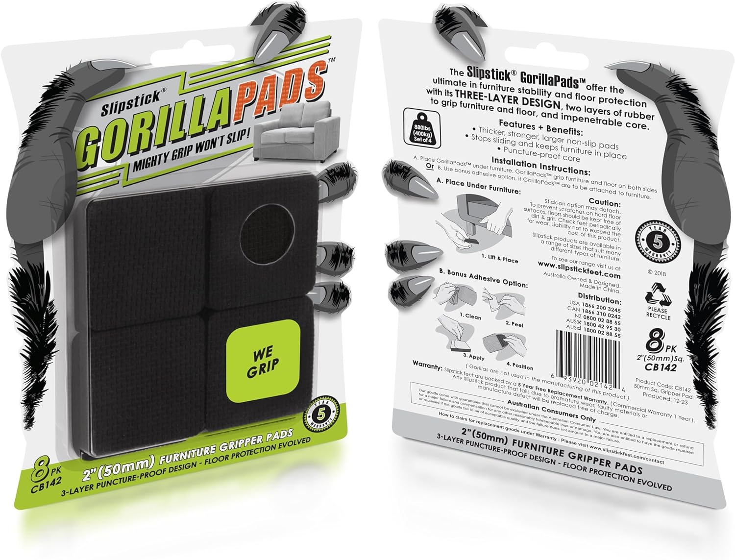 • Mighty grip that won’t slip – GorillaPad furniture grippers by Slipstick are the universal solution to stop furniture from sliding, prevent unwanted movement of furniture / objects, and effectively protect hard surfaces from scratches or damage. Includes 8 premium 2 inch square non slip furniture pads.
