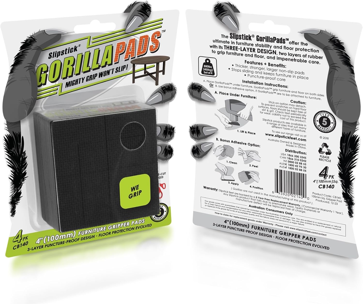 • Mighty grip that won’t slip – Gorillapad furniture grippers by Slipstick are the universal solution to stop unwanted movement or sliding of furniture / objects and effectively protect hard surfaces from scratches or damage. Includes 4 x 4 inch non slip furniture pads that can be cut to size.