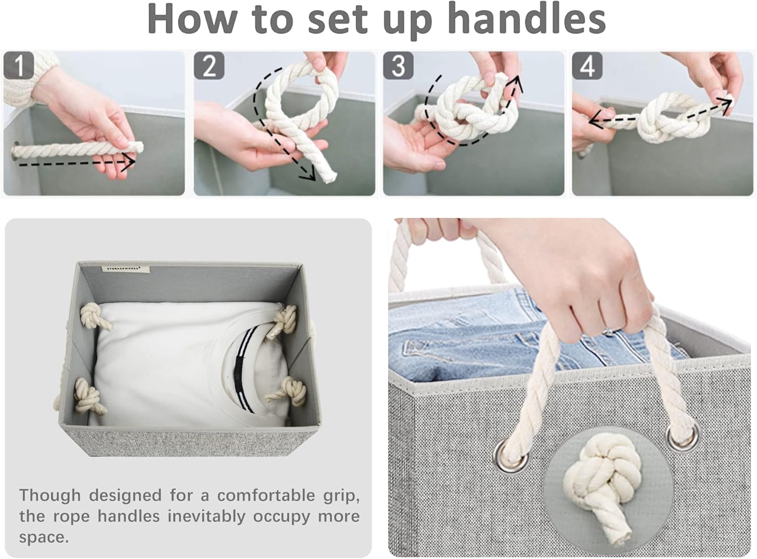 • Closet baskets feature two soft rope handles for comfortable grasping and easy carrying.