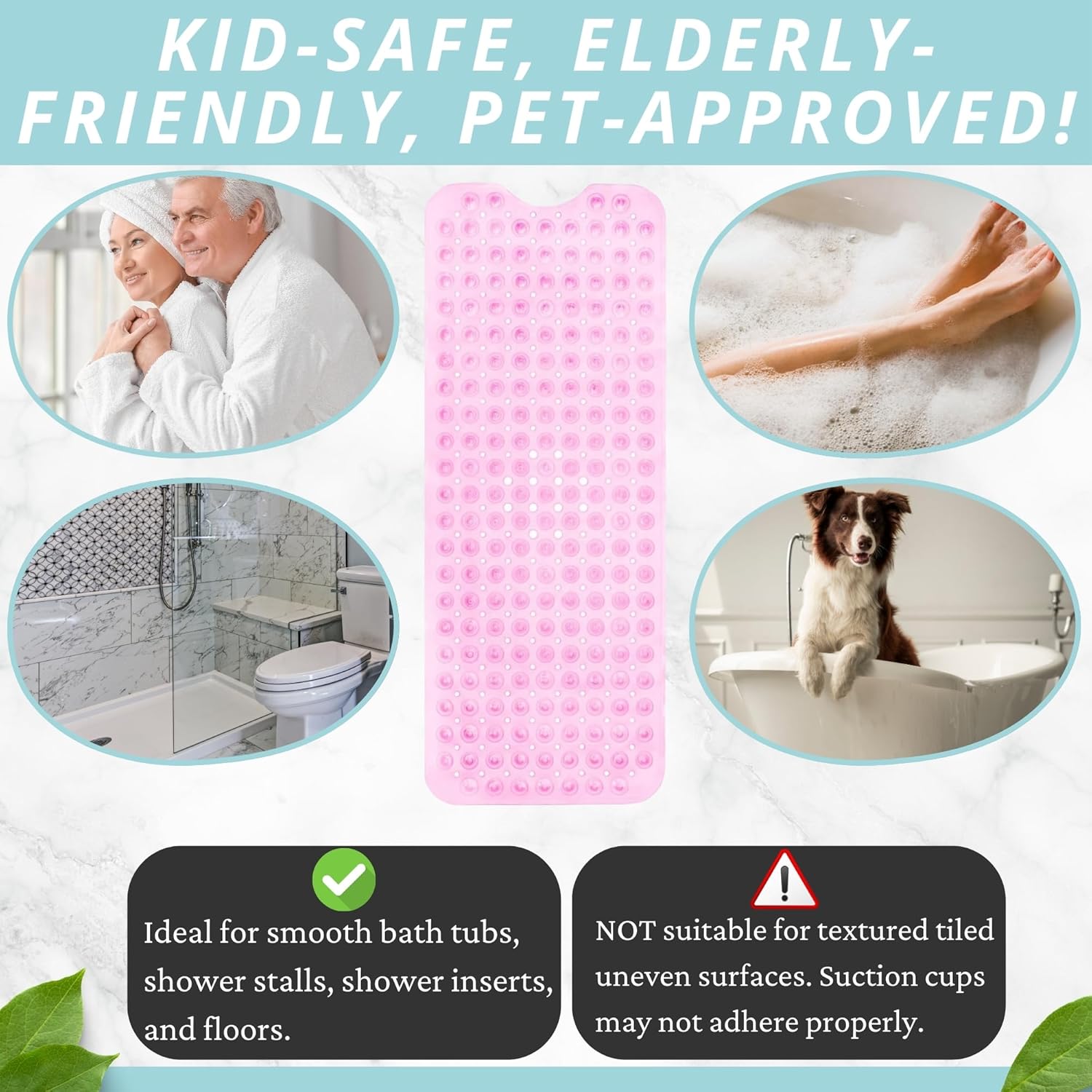 ENKOSI Bath Mat - Large Non Slip Bathtub & Shower Mat - Extra Long 40 x 16 Inch Bathroom Mats for Tub Nonslip Anti Slip Bathmats (40x16 Clear Pink 1-Pack)