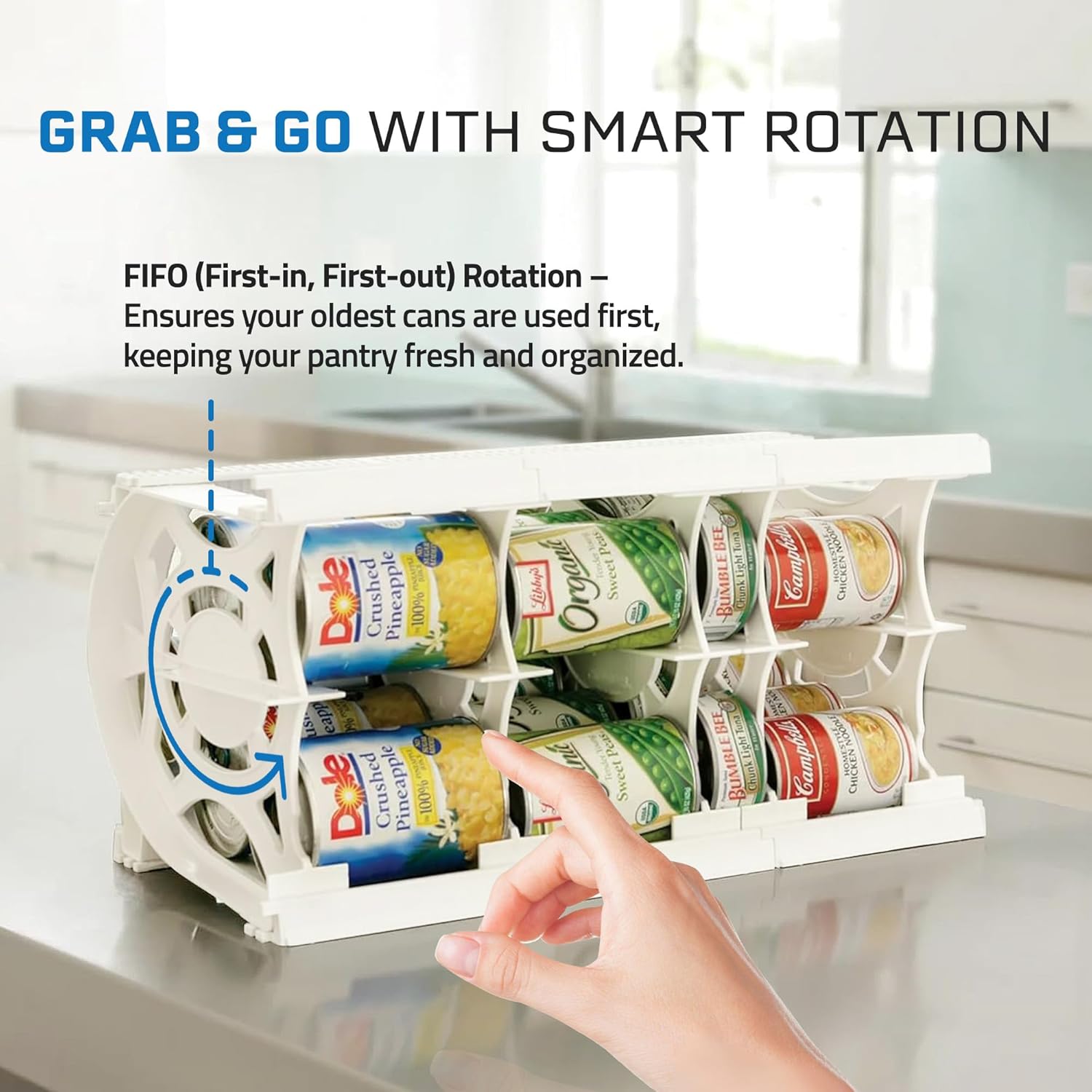 • GRAB & GO WITH SMART ROTATION - Our patented FIFO (First-in, First-out) rotating system ensures your oldest cans are used first, keeping your pantry fresh and organized. Every time you grab a can, the next one rolls forward, so nothing gets lost or forgotten in the back.