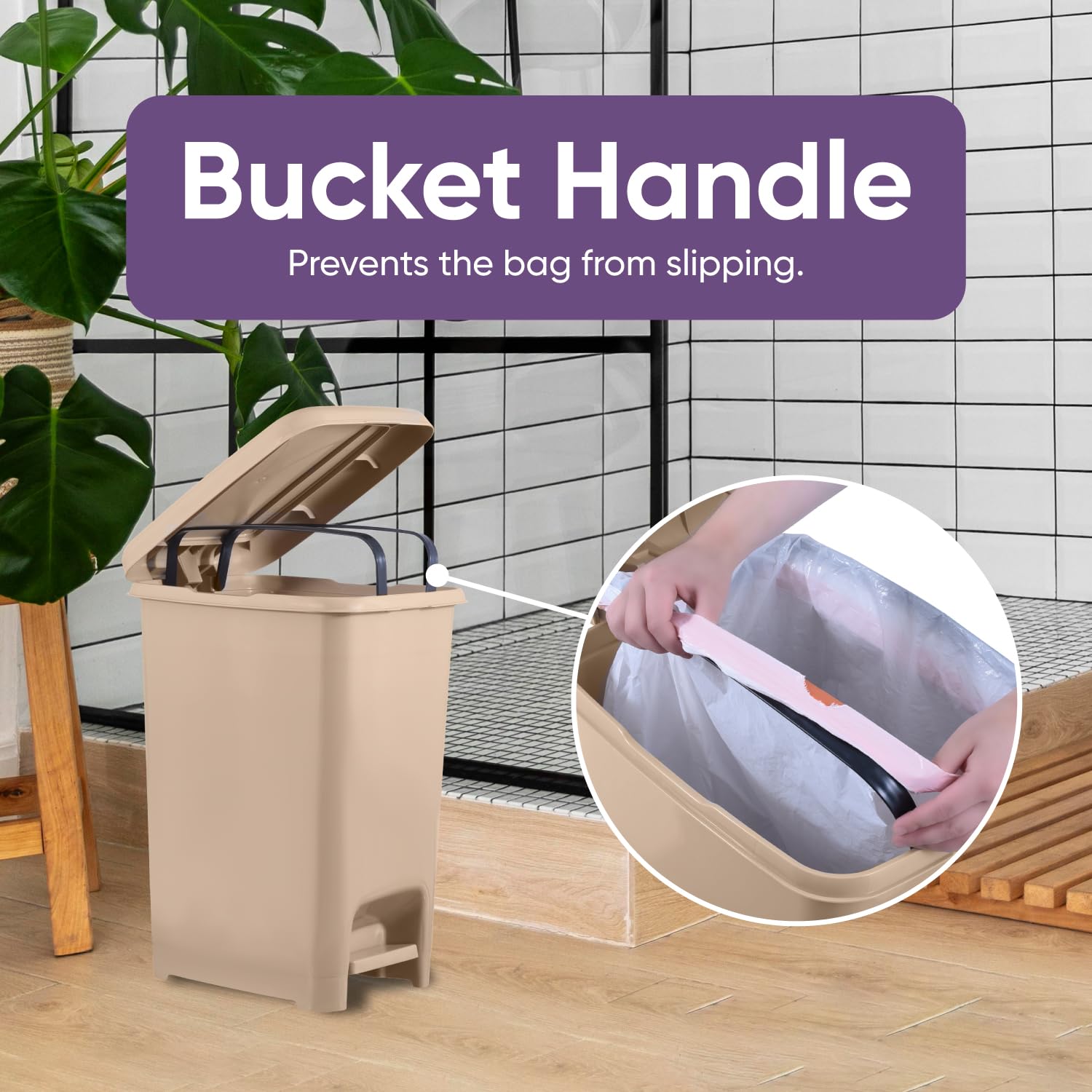 • BUCKET HANDLE PREVENTS BAG SLIPPING - We’ve all been there. You go to put a new bag in your trash can only to have the bag crumple inside the second you put any weight in it. This garbage pails bucket handle feature prevents that annoying scenario from ever happening to you again.