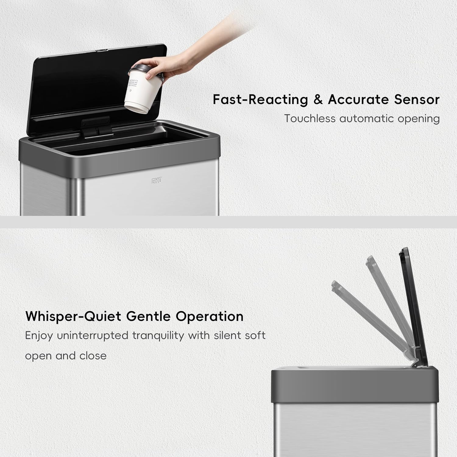 • PREMIUM MOTION SENSOR TECHNOLOGY - Experience the smoothest, most seamless lid opening and closing technology with this EKO hands-free automatic trash can.