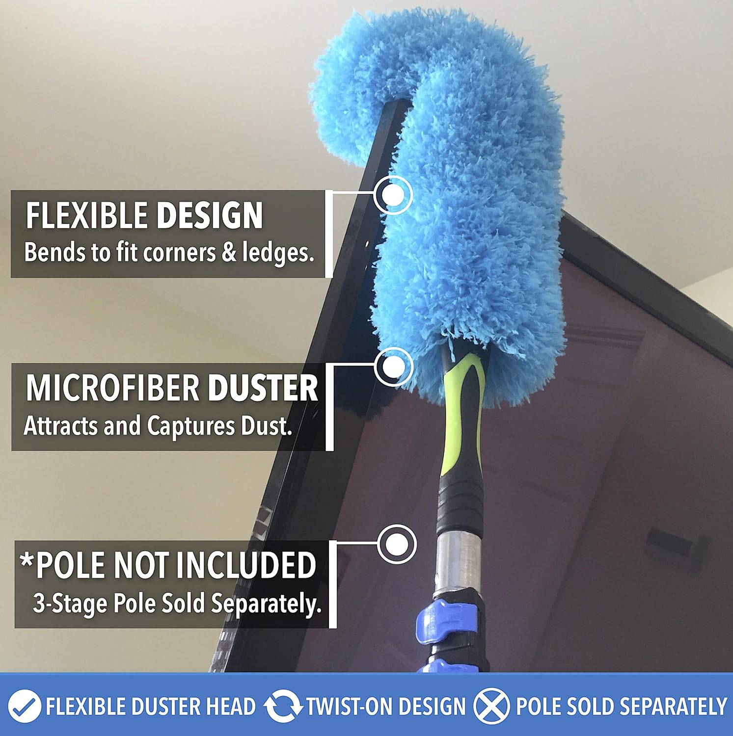 - ELECTROSTATIC MICROFIBER ATTRACTS DUST (POLE SOLD SEPARATELY) – Each Microfiber has a slight positive charge and is so tiny it’s 100 times finer than a human hair – this enables the Flexible Microfiber Duster to attract, grab, and trap dust with ease. Soft rubber tip is on the end of the duster to prevent any scratching. Perfect for cleaning hard to reach spots inside and outside: high ceilings, tight corners, walls, beams, shelves, light fixtures, blinds, window screens, and more!