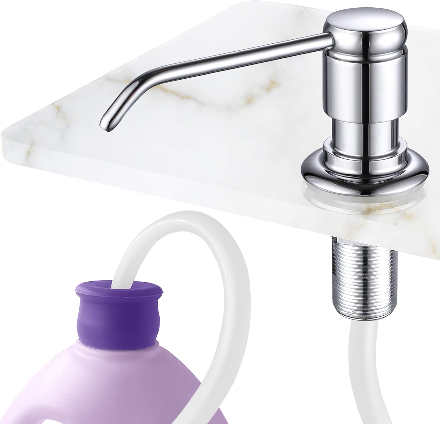 • 【HIGH QUALITY AND MODERN DESIGN】Brass Brushed Nickel soap dispenser pump and head with metal nut, making it not easy to wear and tear, 40’’ Food-Grade silicone tube is soft and elastic, which make the soap flow out smoothly. All of them make your kitchen easy and elegant