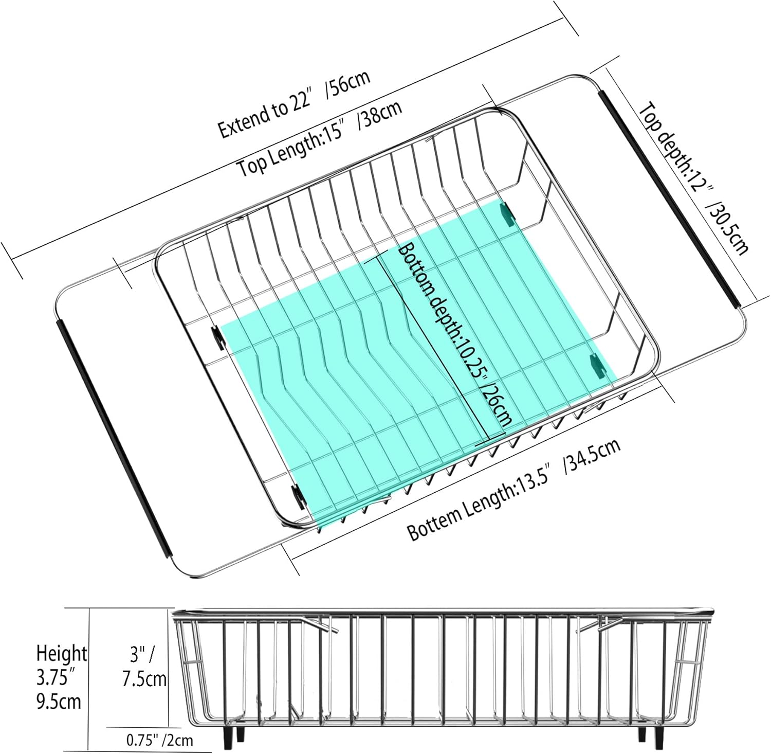 • SIZE DETAILS - Please check the picture 2. Drain basket Height:3.75". length and depth of top of basket:15in x 12in, Length and depth of bottom of basket:13.5in x 10.25in ; Drain basket arm extends 15 to 22 inches long and it can place over the sink measuring between 16 to 22 inches and more than 12.5 inches deep. With extendable arm, it can be used over the sink, on the countertop or in the sink to save space in compact kitchens.