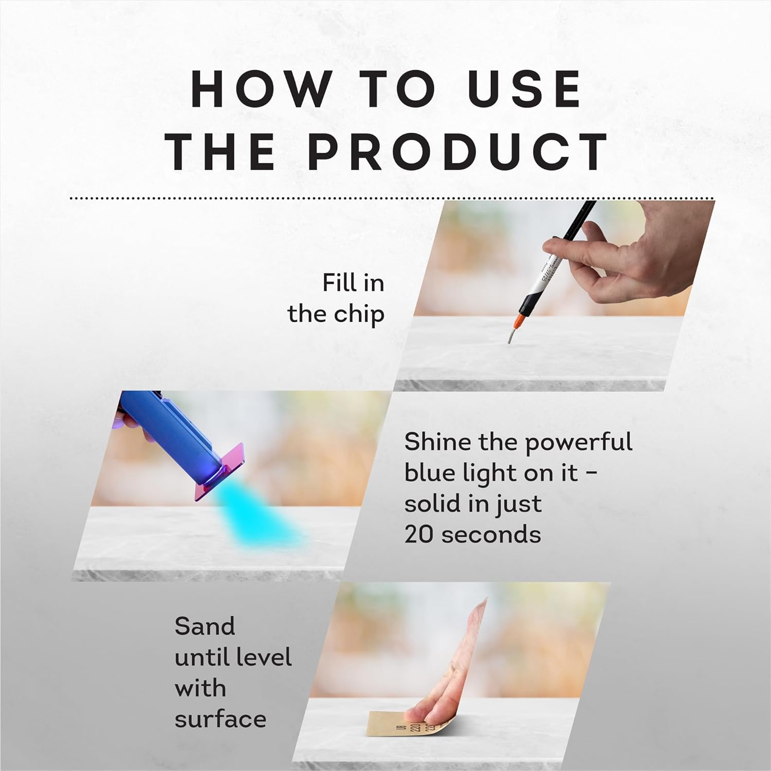 • REFILL FOR THE FASTEST SURFACE REPAIR KIT: The refill includes everything except the blue light unit you already have if you purchased the entire kit before. That means you can continue repairing chips in record time without piling up things you don't need.