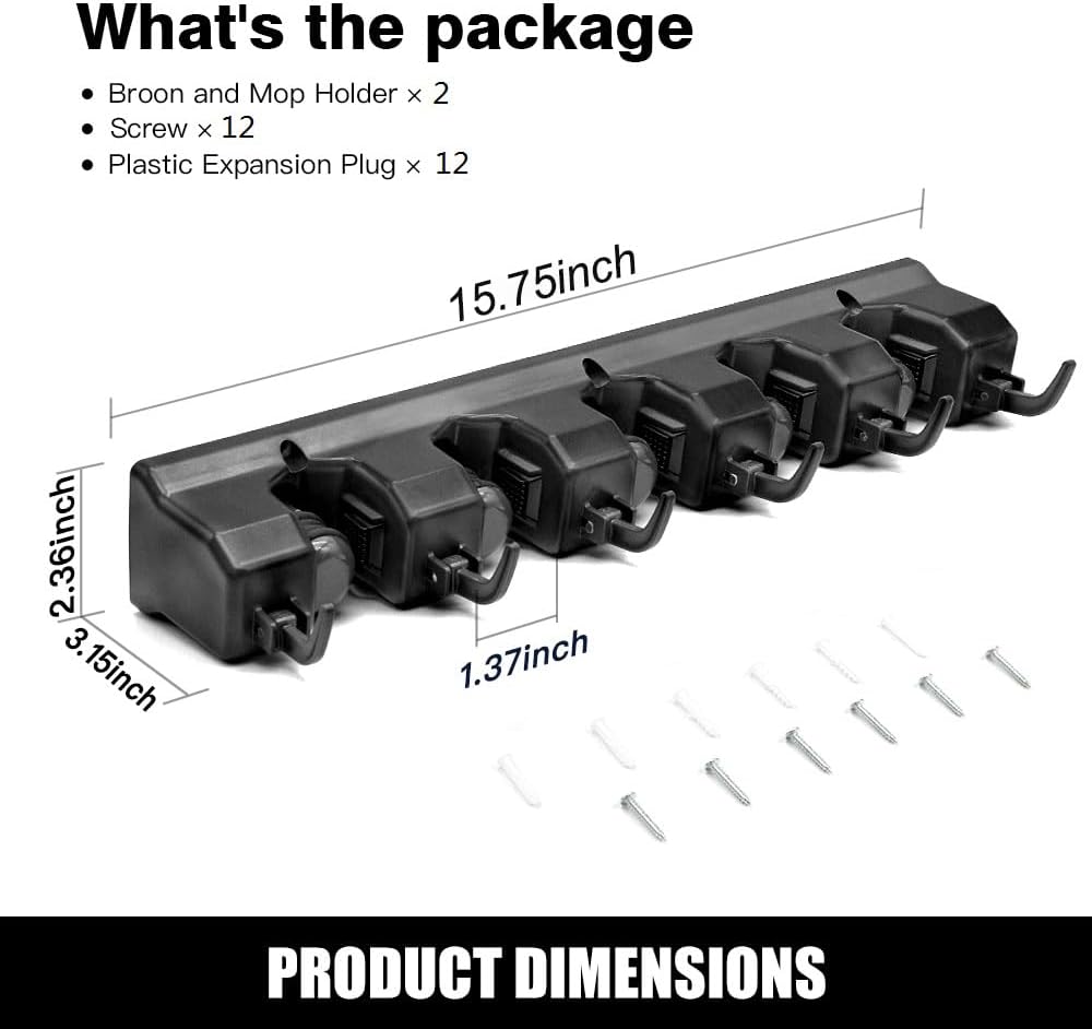 IMILLET 2 Pack Mop and Broom Holder, Wall Mounted Organizer Mop and Broom Storage Tool Rack with 5 Ball Slots and 6 Hooks (Black)