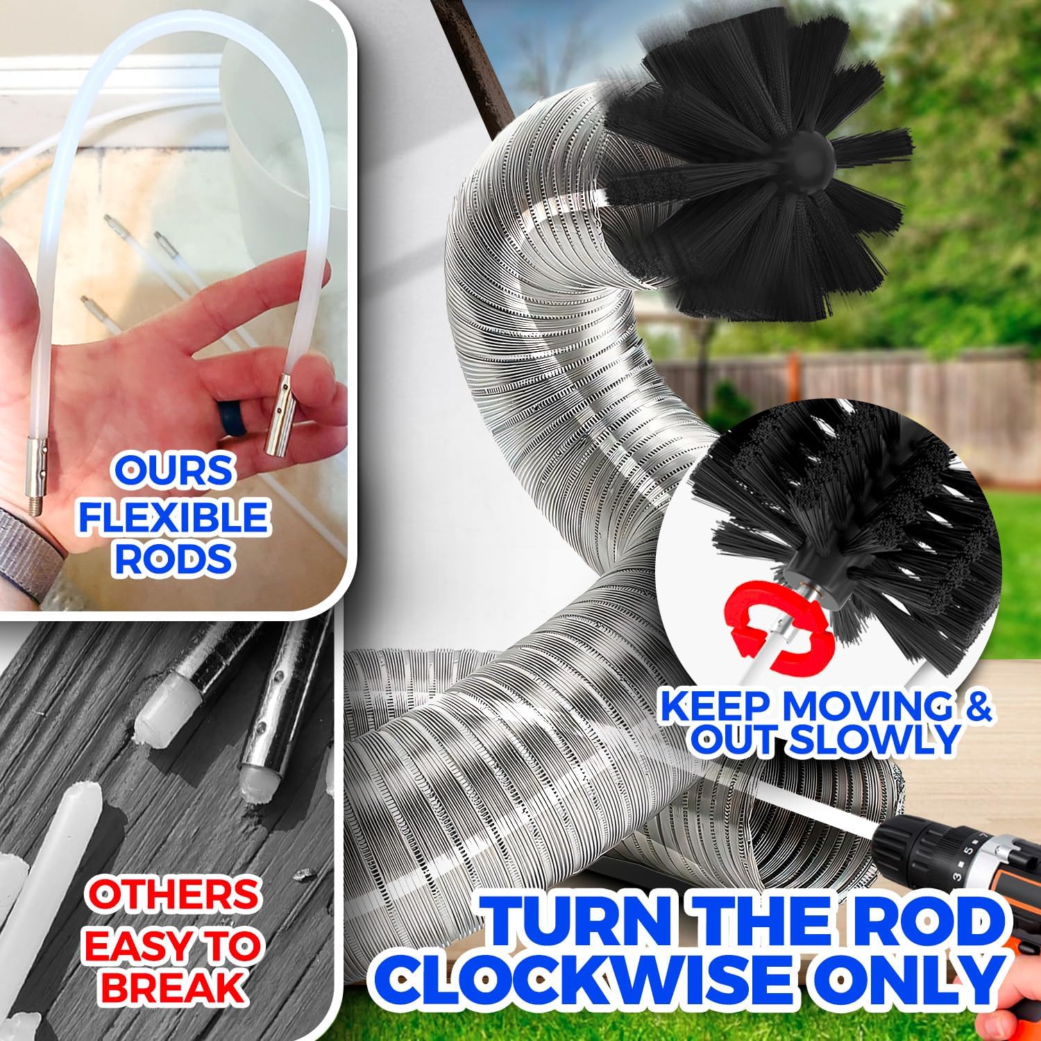 - DRYER VENT CLEANING BRUSH: Dryer vent cleaner kit can be used with or without any kind of power drill and will help you achieve professional results; Just always turn the rod clockwise and keep moving in&out slowly; Kindly remind that while cleaning around corners and turns or stubborn lint trap, slow down and then accelerate slowly