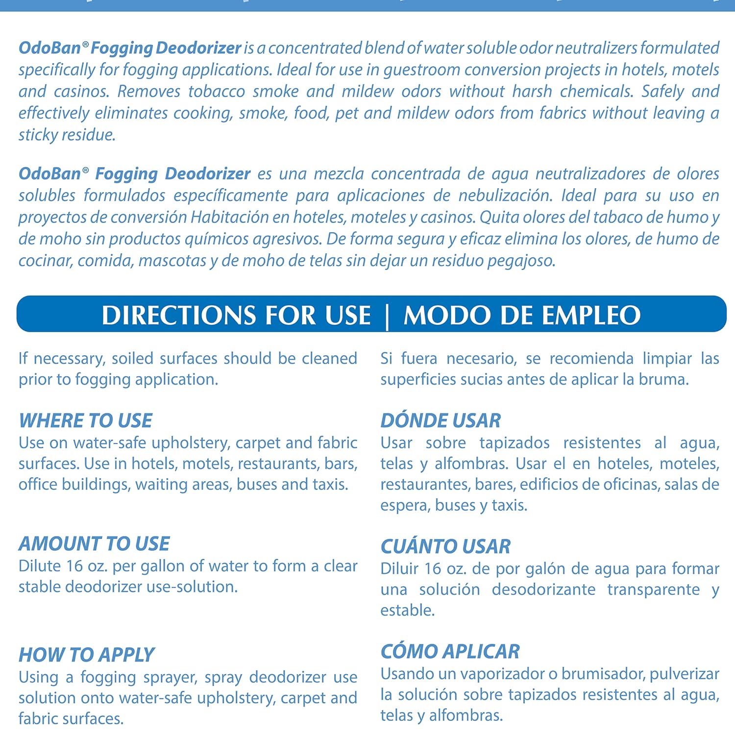• Directions for Use: Use as directed on label. Using a fogging sprayer, spray deodorizer use solution onto water-safe upholstery, carpet, and fabric surfaces. If necessary, soiled surfaces should be cleaned prior to fogging application.