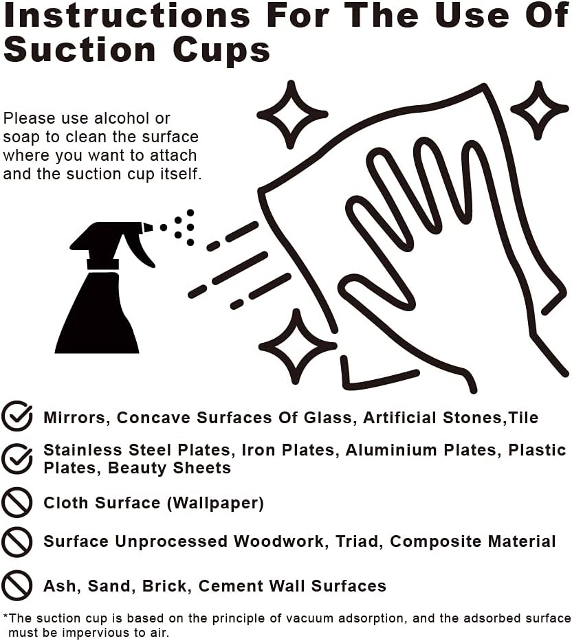 • Easy Tips for Better Suction If the suction cup isn’t sticking, try these: 1.Clean both the surface and suction cup with warm soapy water. 2.Soak suction cup in warm water for 1–2 minutes to soften. 3.Press suction cup head firmly to remove air bubbles. 4.Ensure installation on flat surfaces, not corners or curves.