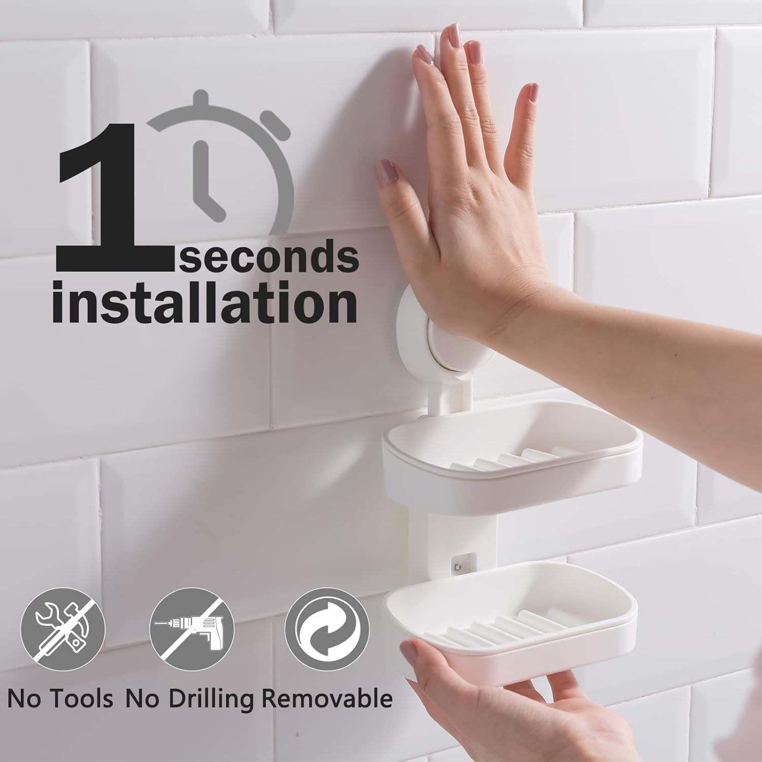 - ONE SECOND & DAMAGE-FREE INSTALLATION: No drilling, no screw, no hole, no glue, no tool to install the bar soap holder for shower wall in just one second. Simply choose a clean and smooth surface, take off protective cover and push the board "PUSH" hardly until you hear sound of "PUFF". Even a child can install this double layer wall mounted soap dish easily